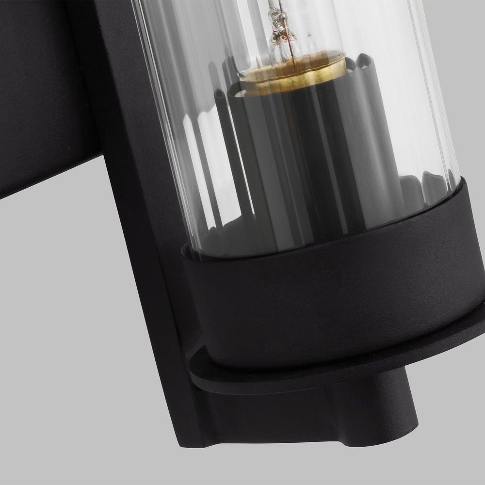 Clear fluted glass shades give the Alcona series a refined industrial look. The elegant square backplate and metal center ring provide a floating glass effect. The Alcona one light outdoor pendant fixture creates a warm and inviting welcome presentation for your home's exterior. Available in a handsome Black or Antique Bronze finish.