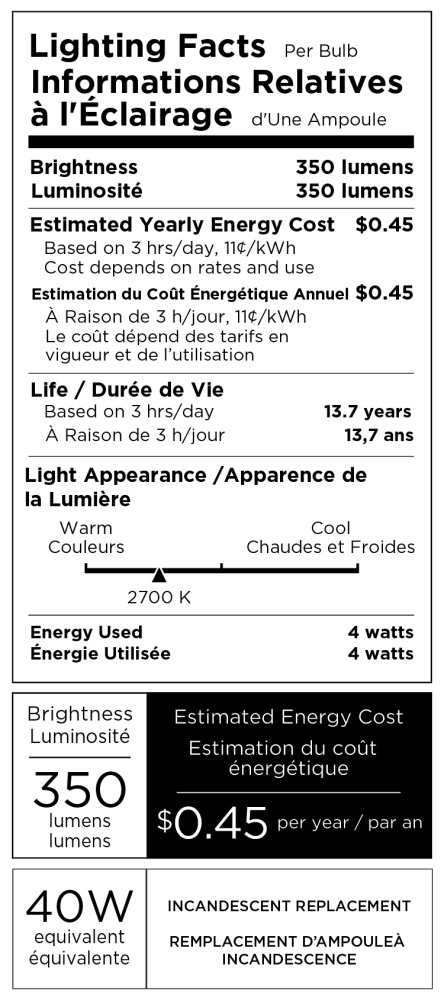 Frosted CA11 4W LED with 2700K warm light and 350 lumens; perfect for soft, even illumination.