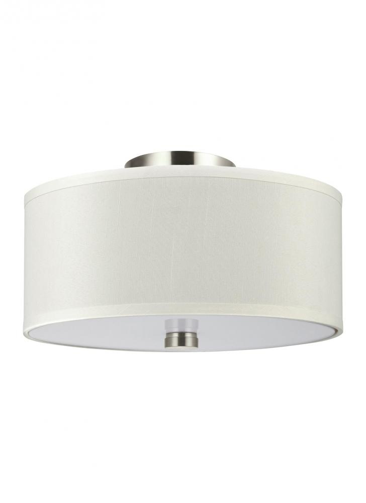 The Dayna Shade Pendants two light semi flush fixture in brushed nickel enhances the beauty of your home with ample light and style to match today's trends. The sleek, fabric shades and smooth acrylic diffusers of the Dayna shade pendant collection by combine to create a warm glow. Finished-off with decorative metal finials to secure the White Acrylic diffusers in place, these fixtures convey a tailored look while creating both ambient and task lighting. The assortment includes two-light, three-light and four-light pendants and a two-light flush /semi-flush convertible all with classic drum shades, as well as a large four-light pendant with an angular trapezoidal shade, and all are offered in either Brushed Nickel or Burnt Sienna finishes with either Cream or Beige Faux Linen fabric shades. Both incandescent lamping and ENERGY STAR-qualified LED lamping are available; all fixtures are California Title 24 compliant.