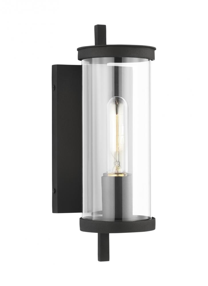 The Eastham one light outdoor wall fixture in textured black by Chapman & Myers is designed with an upright square metal crossbar which extends beyond the top and bottom of each light to both support and define each light. The crossbars intersect two stepped top & bottom metal rims and capture the cylindrical glass shade. Each is illuminated by a tubular filament bulb.