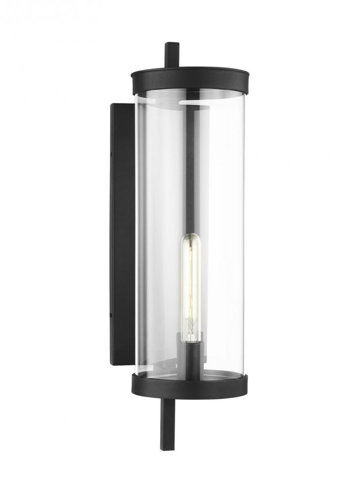 The Eastham one light outdoor wall fixture in textured black by Chapman & Myers is designed with an upright square metal crossbar which extends beyond the top and bottom of each light to both support and define each light. The crossbars intersect two stepped top & bottom metal rims and capture the cylindrical glass shade. Each is illuminated by a tubular filament bulb.
