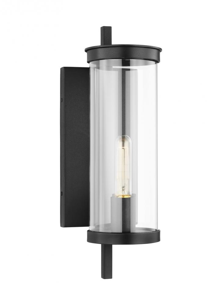 The Eastham one light outdoor wall fixture in textured black by Chapman & Myers is designed with an upright square metal crossbar which extends beyond the top and bottom of each light to both support and define each light. The crossbars intersect two stepped top & bottom metal rims and capture the cylindrical glass shade. Each is illuminated by a tubular filament bulb.