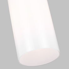 - A single bulb is suspended through a frosted glass shade and accented with a black leather band.