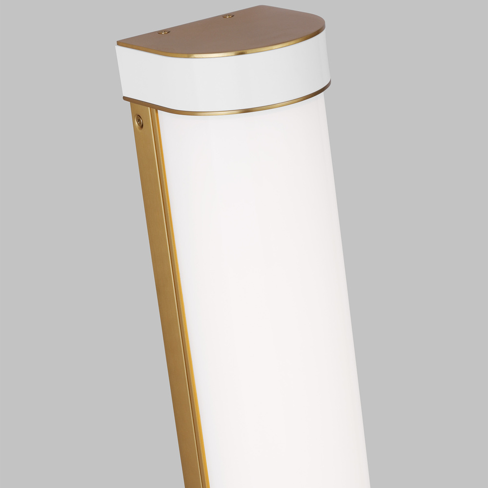The Monroe vanity is inspired by graphic enameled metal jewelry and decorative accessories from kate spade with a nod to late 50s atomic era colorful designs. Monroe exhibits clean lighting profiles and dressed them up with painted sections and metal accents. Available in a Burnished Brass and Polished Nickel finish.