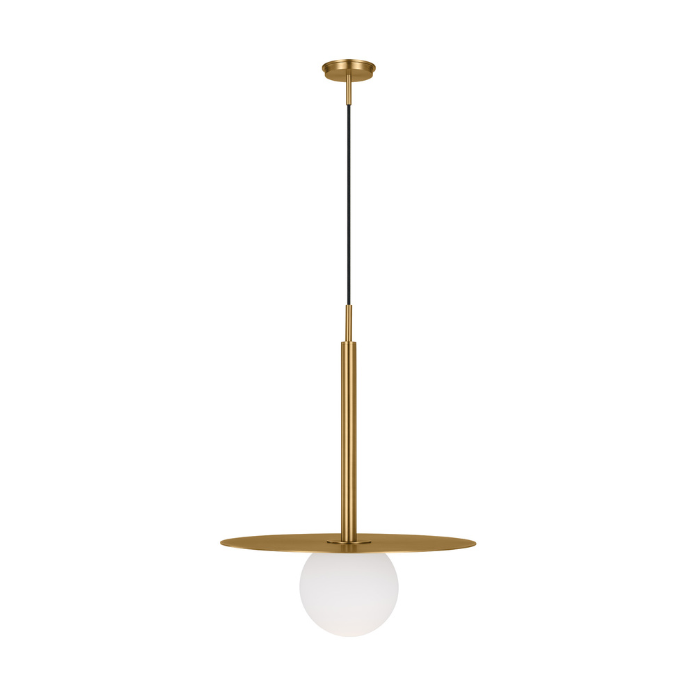 The Nodes one light indoor pendant in burnished brass provides abundant light to your home, while adding style and interest. Nodes task, ceiling and wall lighting is minimal yet bold, highlighting Kelly's distinctive juxtaposition of mixed-materiality and curvilinear form. Light radiates from milk glass globes set against metal discs. All fixtures can be used or without the discs. The cast canopy is available in Burnished Brass or Midnight Black. Hanging fixtures within this family feature black fabric cords, while pivot sconces can be cord and plug or hard wire.