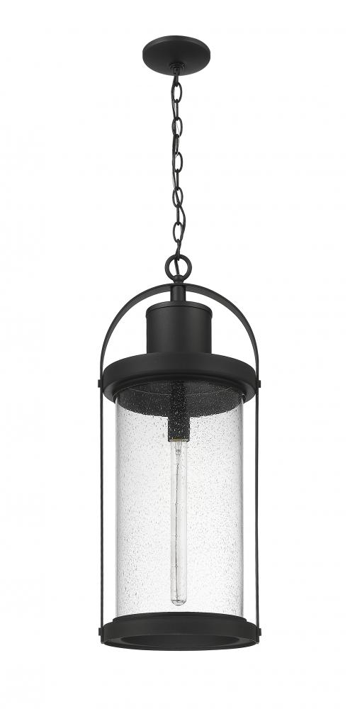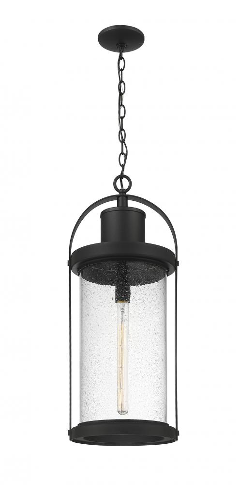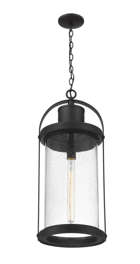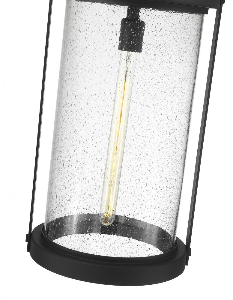 This one-light outdoor chain mount ceiling fixture can revitalize the look of your porch or patio space with its lantern-like appearance and strikingly modern silhouette. Black aluminum caps the top and bottom of a cylindrical shade thats finished with clear seedy glass. The LED bulb effectively illuminates your space, making this a clear choice for sleek, energy-efficient exterior lighting.