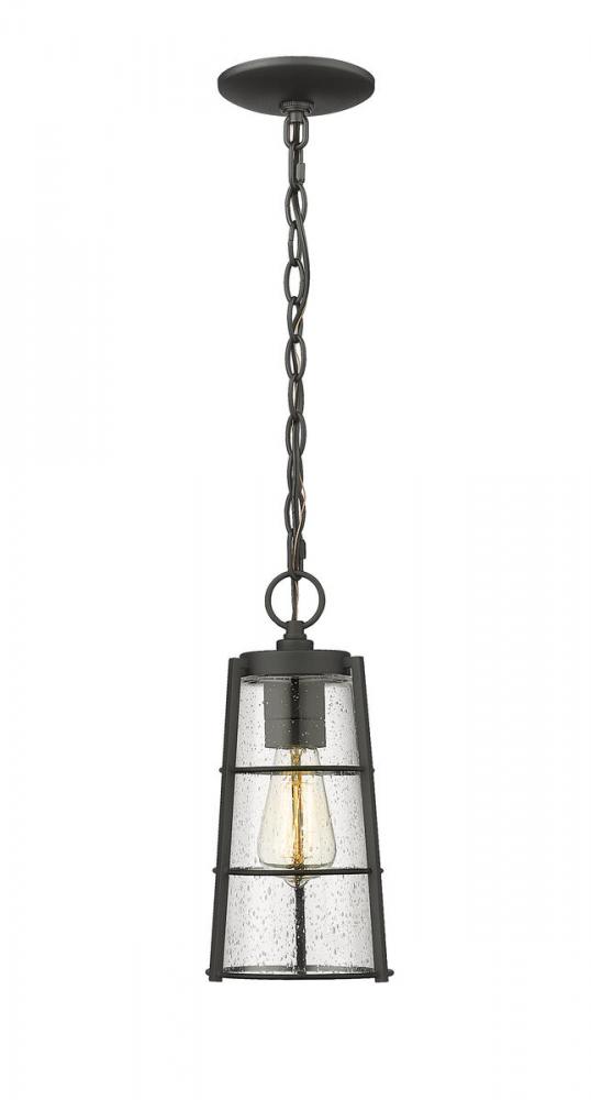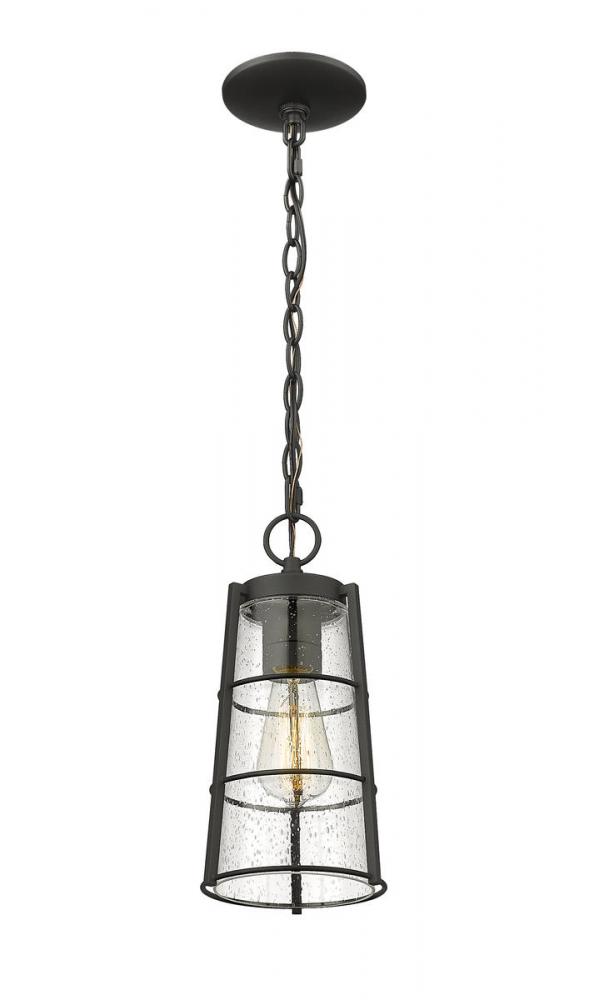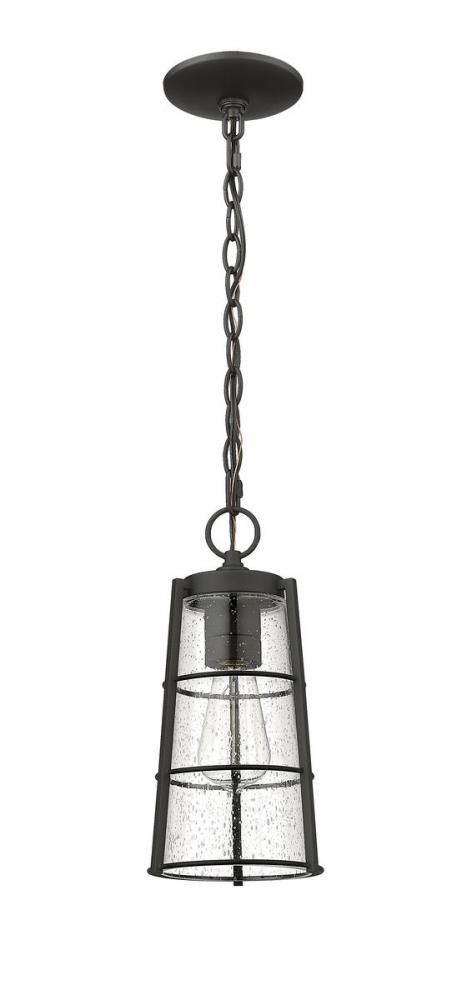 A vintage themed motif turns this modern one-light outdoor chain mount ceiling fixture into a compelling addition to exterior spaces. Perfect for a covered porch or patio or a gazebo space, this light from the Helix collection offers romantic clear seedy glass in a conical shade and housing made of hand-worked black finish aluminum. With village industrial inspiration, this light works in modern and transitional design schemes.