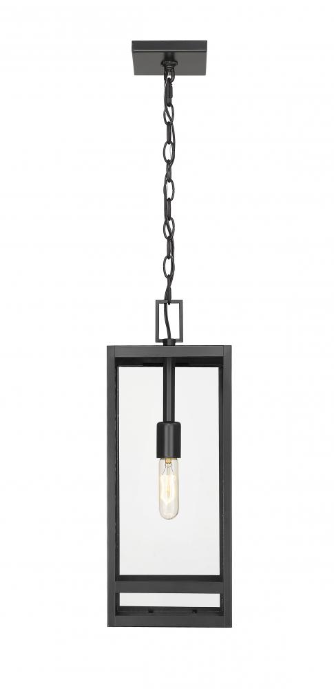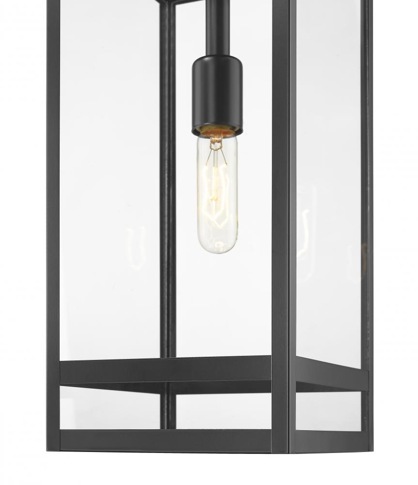 Suspending from a covered patio or gazebo, the Nuri one light outdoor chain mount ceiling fixture offers a clean, crisp aesthetic with linear design elements. Go fully modern with a hint of transitional vibes in a light featuring linear styling of a black finish steel frame and bulb mount, with a matching suspension chain and ceiling mount. Clear glass panels provide a full interior view of a c harming slender bulb mount.