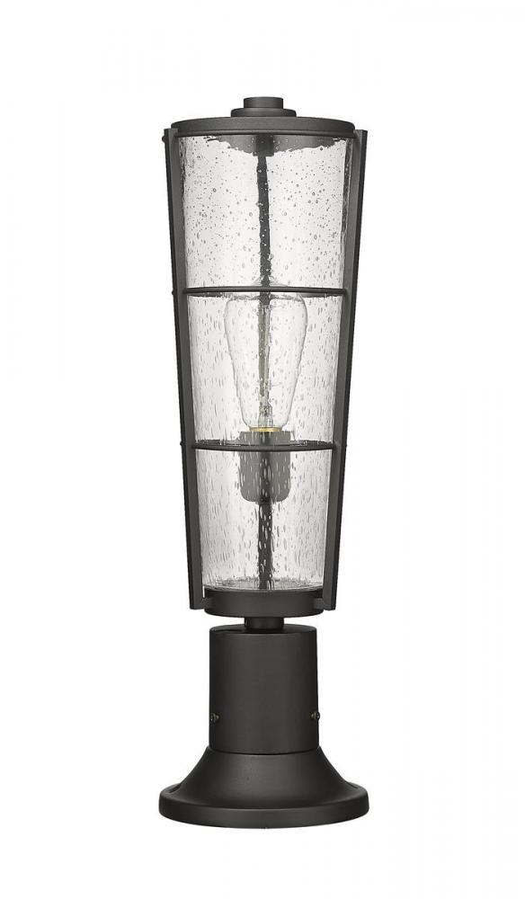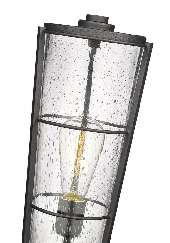 Chic and stylish lantern-influenced design elements offer a mix of old and new to this one-light outdoor pier-mounted fixture. This fixture from the Helix collection borrows from a nautical theme with industrial attitude, blending an ornate linear design in hand-worked black finish aluminum. A romantic clear seedy glass shade offers mood-enhancing benefits.