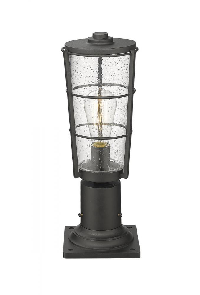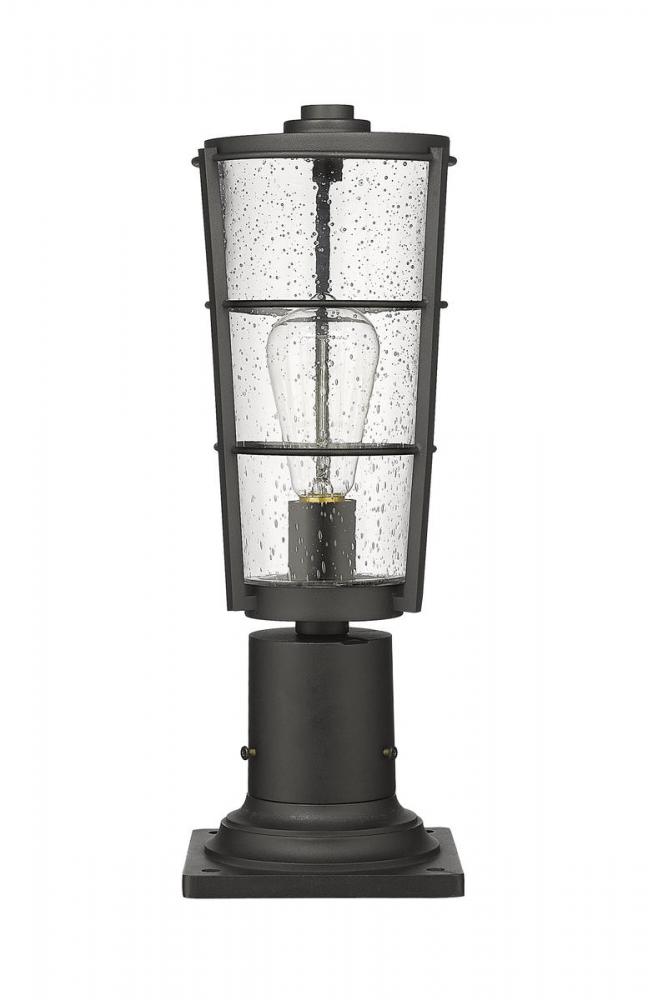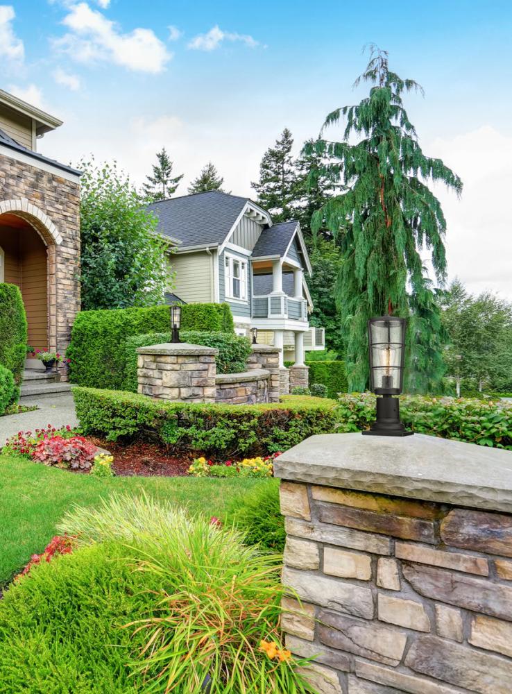 Vintage charm goes modern with this lantern-inspired outdoor pier-mounted fixture. This single light fixture from the Helix collection delivers a sleek look with hand-worked black finish aluminum and a gorgeous shade made of clear seedy glass. Let this elegant pier-mounted fixture bring classic sophistication to a custom garden space or walkway.