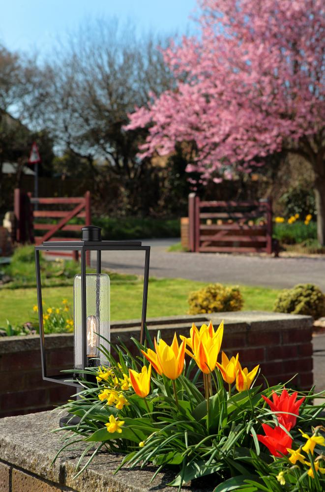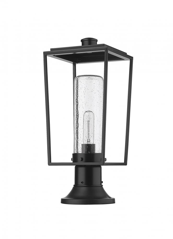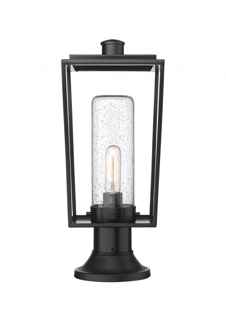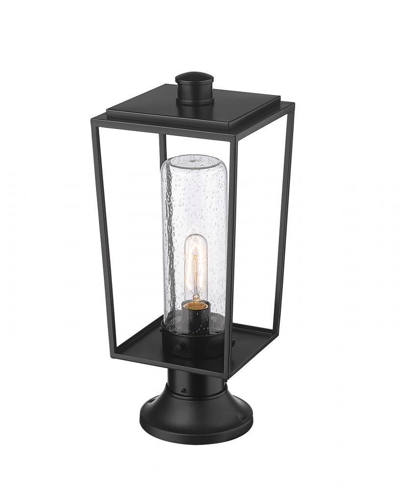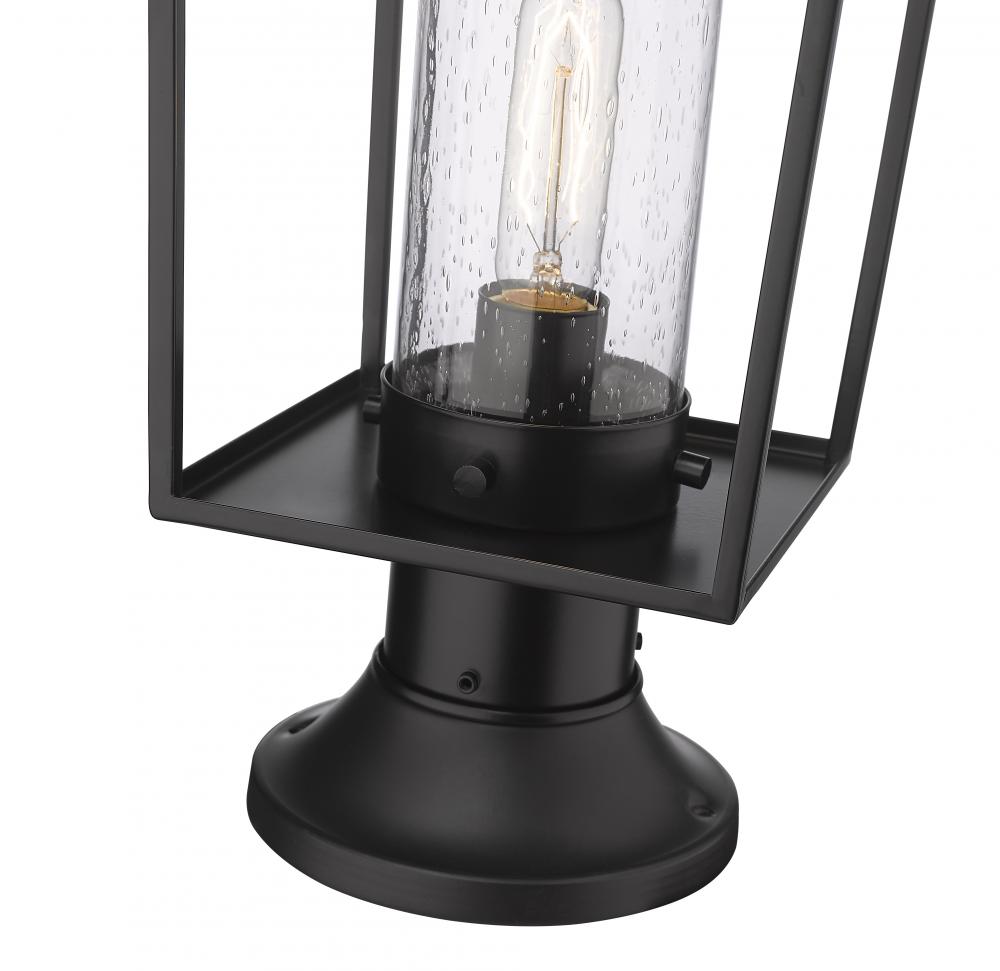 Choose the Sheridan one-light outdoor pier mounted fixture to embellish the sophisticated design of a custom landscaped or garden space. Its charming village-influenced lantern motif features construction of black finish aluminum & steel in an open box style with a romantic seedy glass cylinder shade. Perched atop a flared base, this fixture offers weather-resistant materials that stand up to the elements.