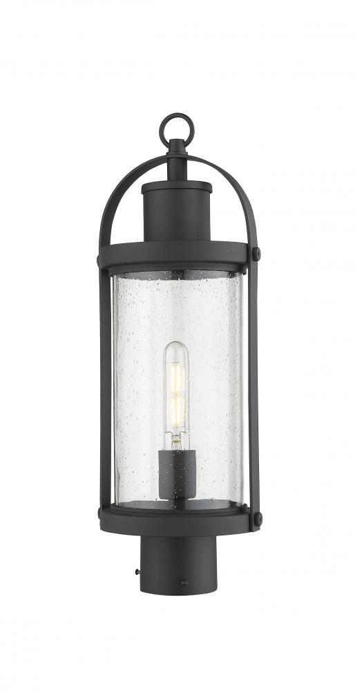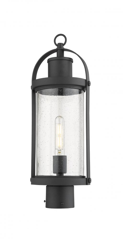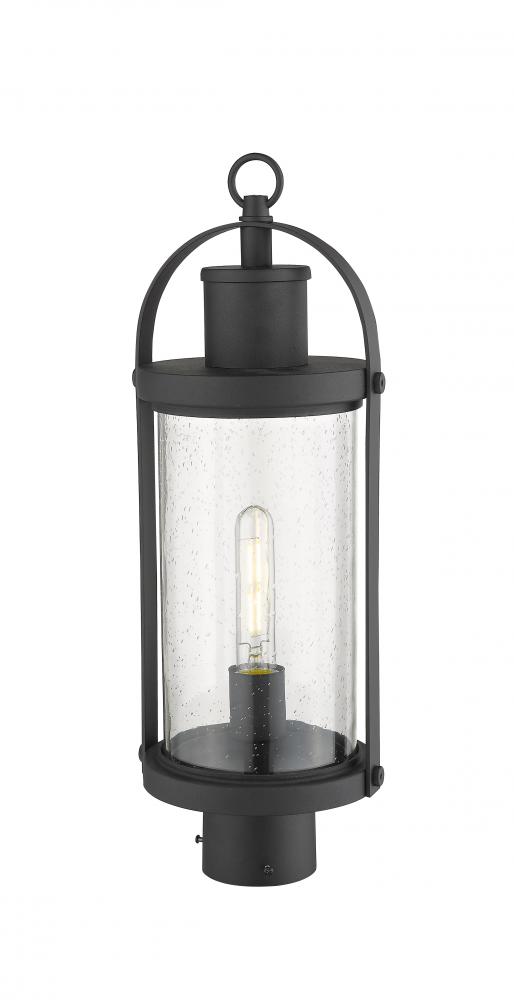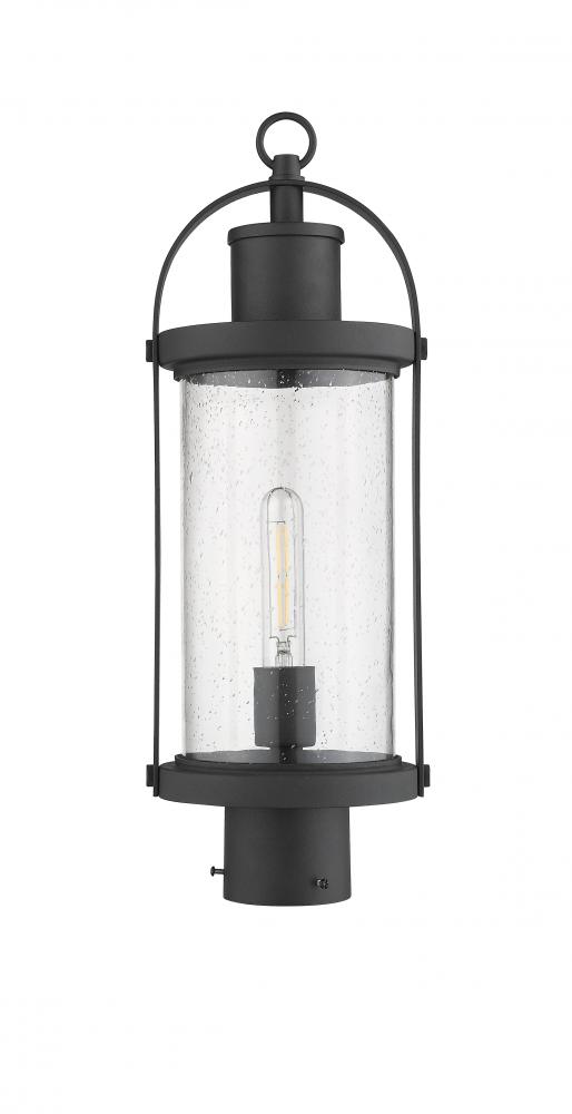 Lantern-inspired, this one-light post light transforms any outdoor space with charm. The vintage-like silhouette is complete with a textured shade and sleek black hue.