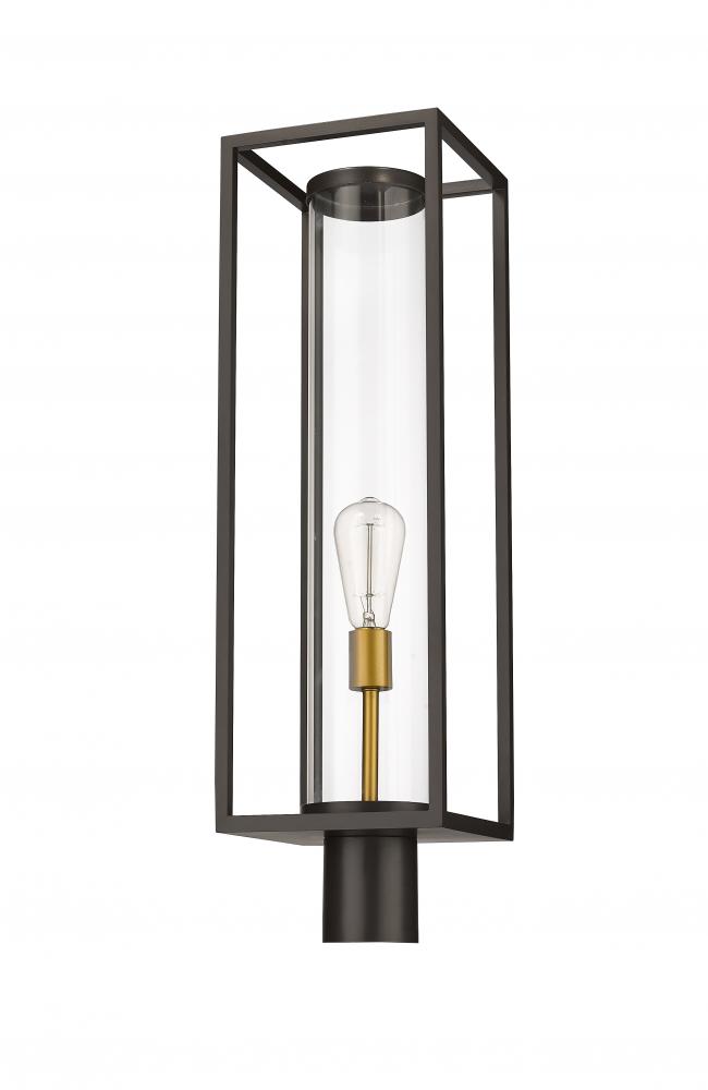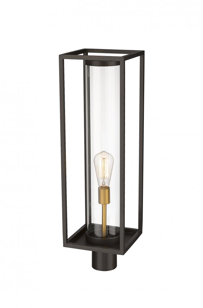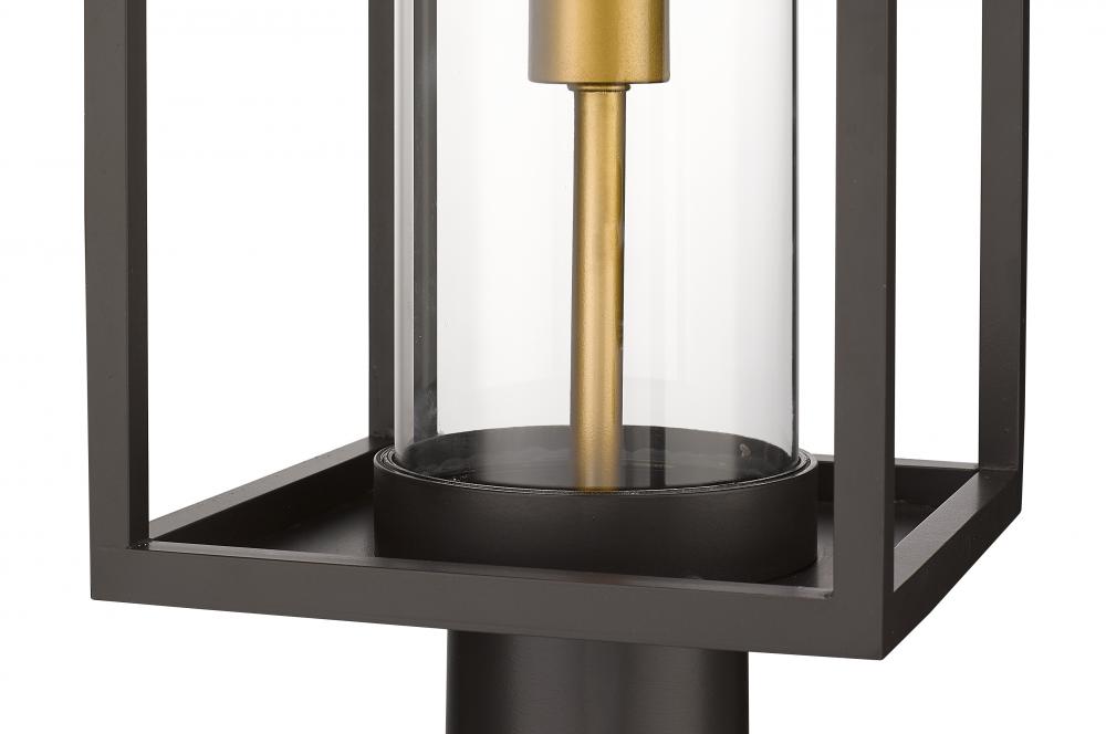 Illuminate spacious patios and surrounding landscapes with this contemporary outdoor post mount fixture from the Dunbroch collection. Featuring a rectangular lantern with a thin aluminum frame, this outdoor post mount can be placed on deck corners and railings to cast some light. This outdoor light fixture also features a timeless deep bronze finish with a striking, warm brass accent in the single light fixture, which is encased in a more modern, glass tube-like globe.