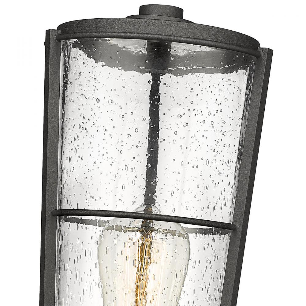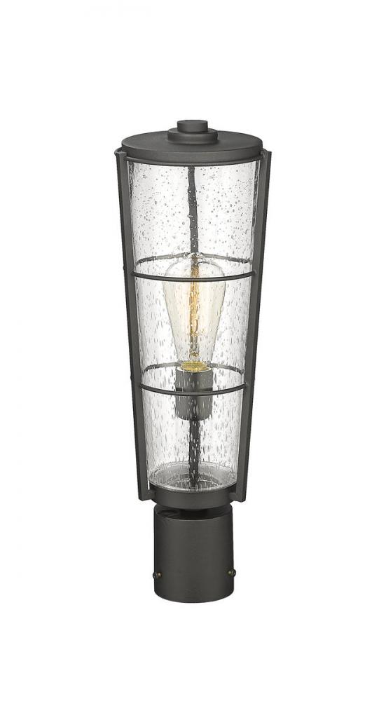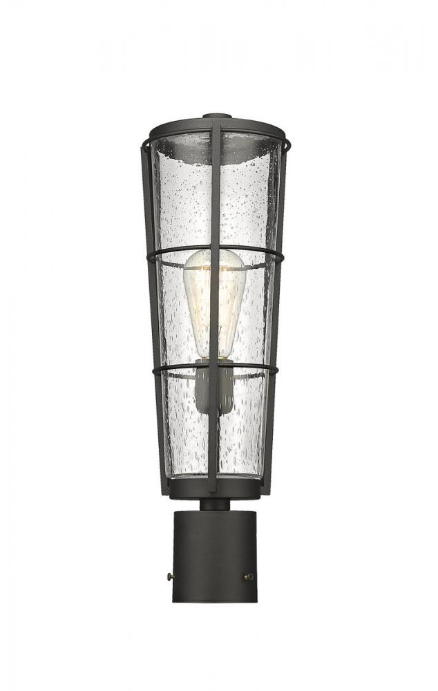 Top an existing exterior light post with this charming outdoor post mount fixture, a tasteful design borrowing from a village industrial theme. This light fixture from the Helix collection offers a lantern-inspired design with a hand-worked black finish aluminum frame and romantic clear seedy glass shade.