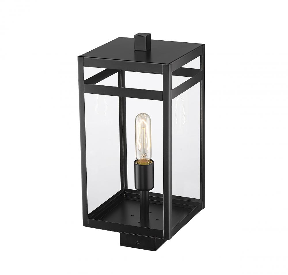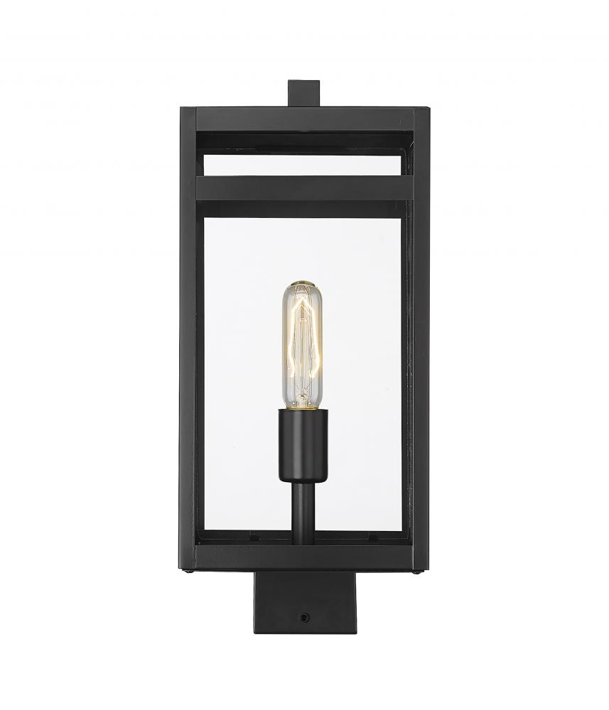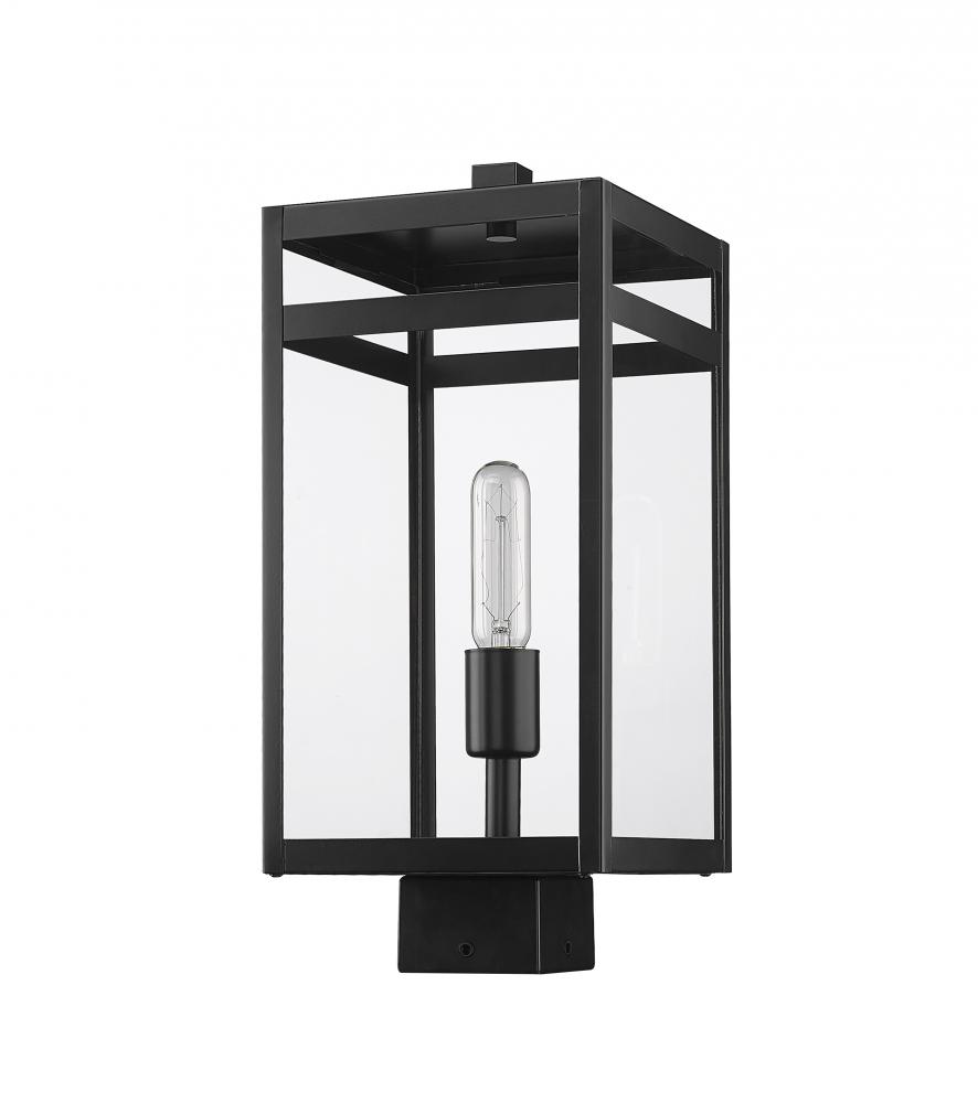 The Nuri one-light outdoor post mount fixture tops an existing post to refashion a contemporary exterior space with personality. Chic linear styling offers the geometric vibes of sheer modern aesthetics, adding an invigorating update to a residential or commercial property. Crafted of black finish steel, its box-like frame and slender bulb mount feature clear glass panels for an unobtrusive focus on definition.