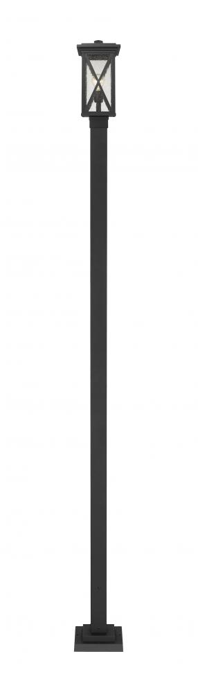 This one-light outdoor post mounted fixture has a straight-edged black aluminum post supporting a black cage with a clear seedy glass finish that softly diffuses light to provide a welcoming glow alongside your driveway or at your front entrance. Compelling X-accents bring dimension and character. Its classic design goes with any outdoor decor, and makes a beautiful impression.