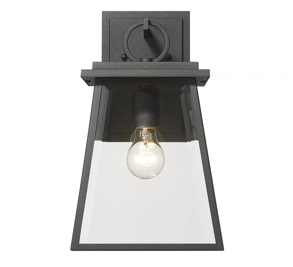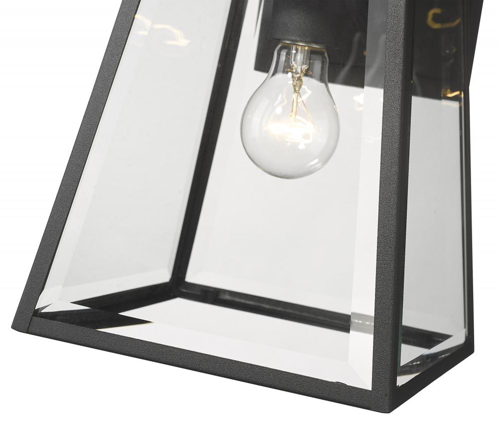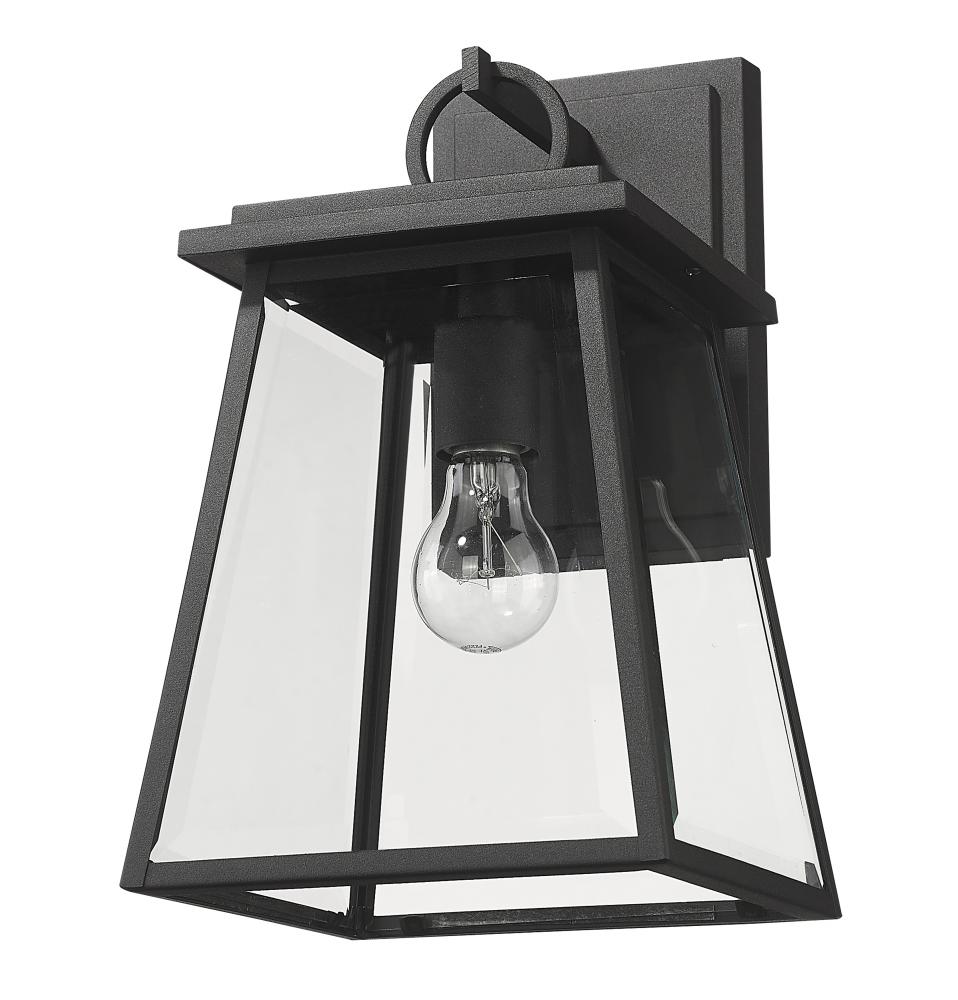 A tapered lantern-inspired silhouette embellishes modernized character with origins to a village nautical aesthetic. Choose this one-light outdoor wall sconce from the Broughton collection to elevate the mood on a structure, adding sophistication and style. Black finish aluminum framing and clear beveled glass panels deliver a tasteful look suitable for all types of residential and commercial structures.