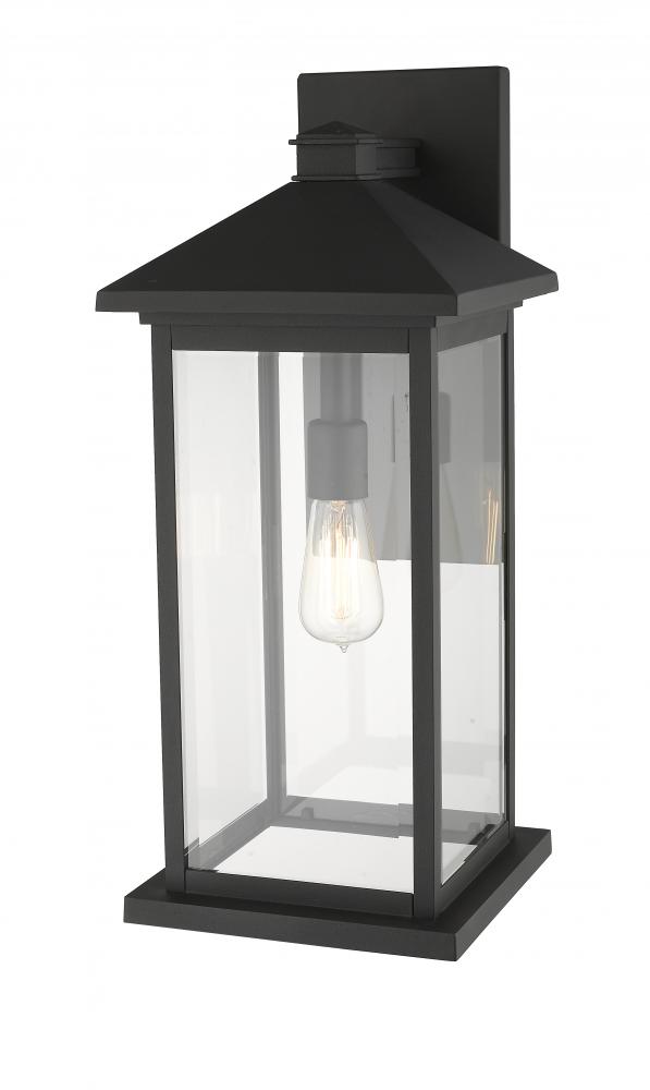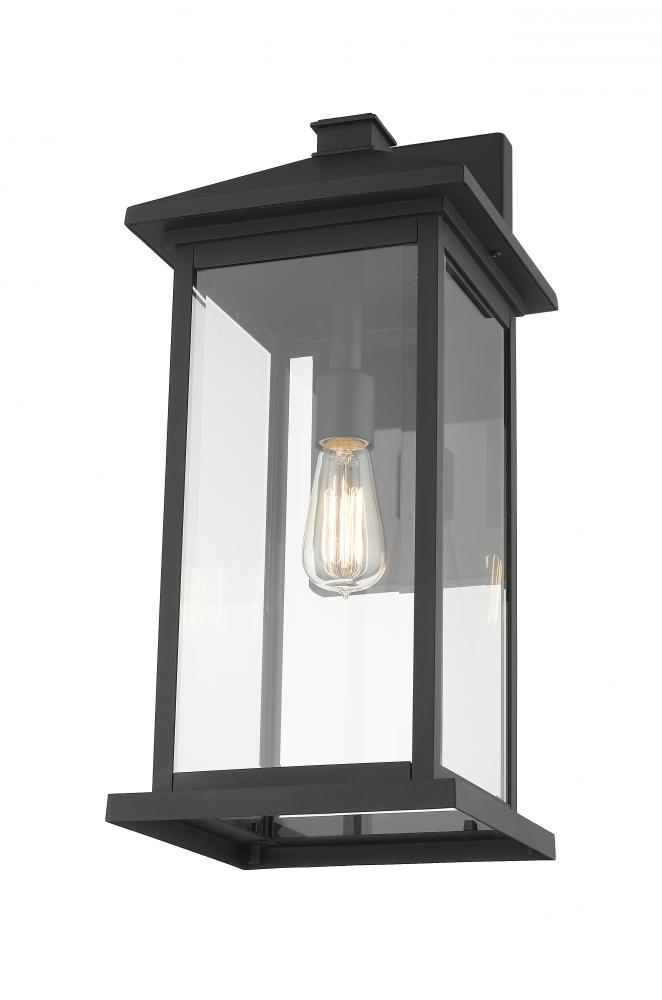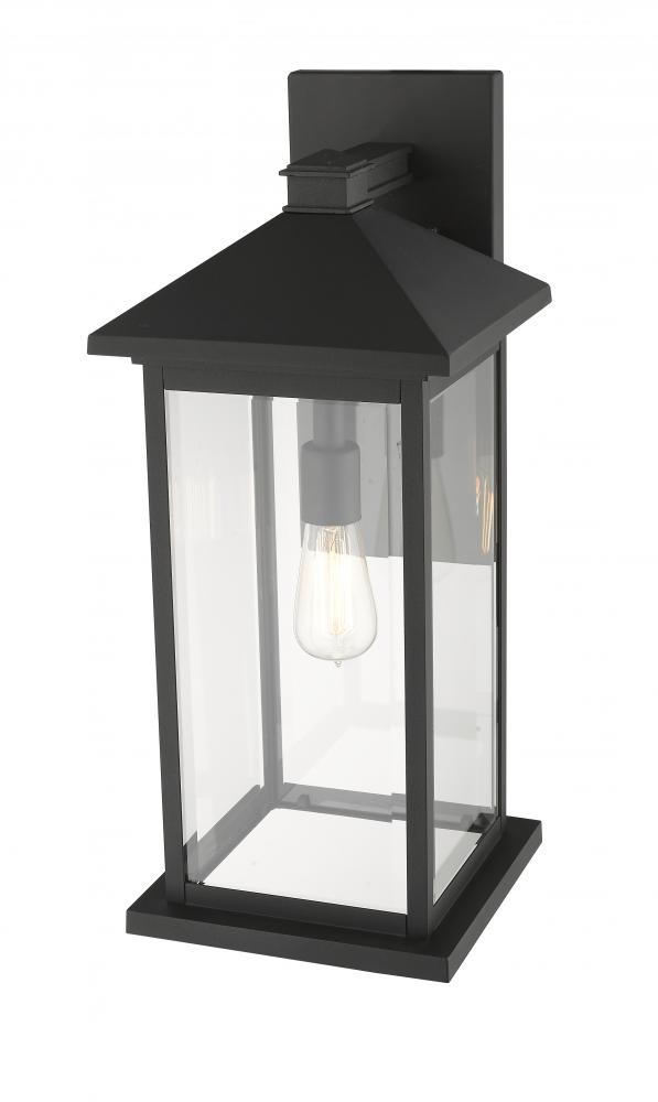 The elongated silhouette of this one-light wall lantern is given a sophisticated upgrade with a deep black finish. The clear beveled glass panels from the sleek sides cast a bright, even glow over a porch or back door.