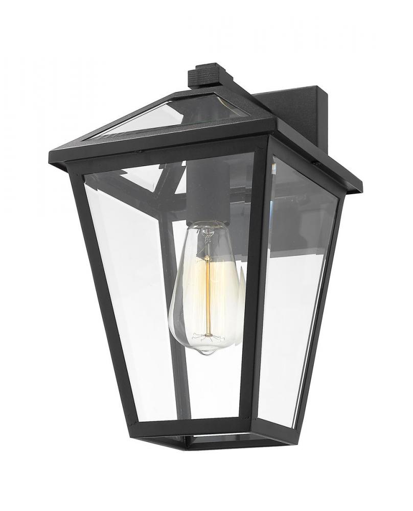 Illuminate an exterior front or back yard space with a classic fixture reflecting a charming village theme. Made from Midnight Black metal and clear beveled glass panels, this single-light outdoor wall sconce delivers a charming upgrade with soft lighting on a residential structure.