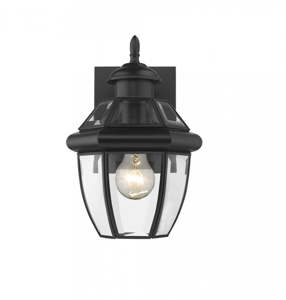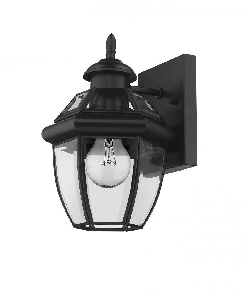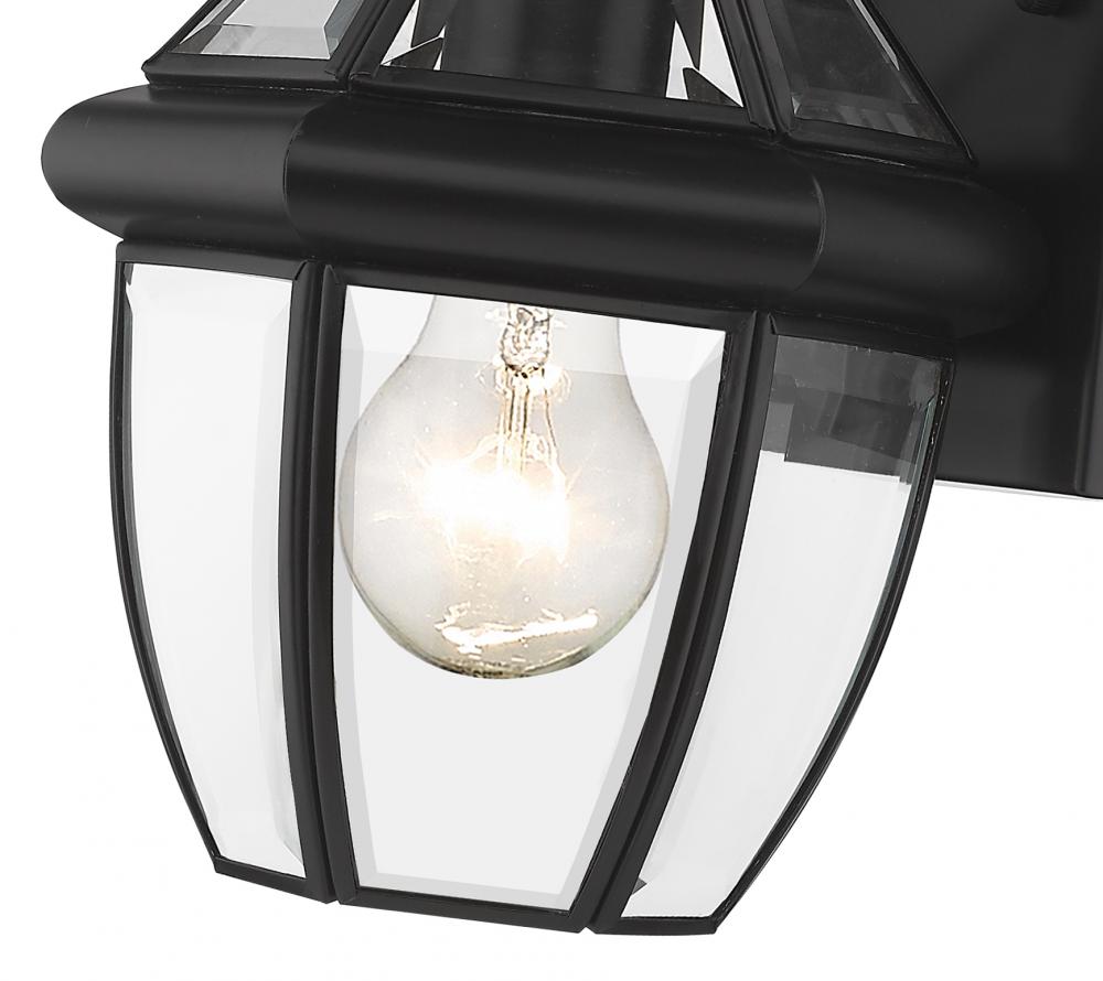 This one-light outdoor wall sconce adds a classic silhouette to the lighting in your patio, deck or porch area. With its one robust bulb, the sconce provides soft, effective illumination. A multi-sided clear beveled glass shade has a black steel frame, creating an elegant impression.