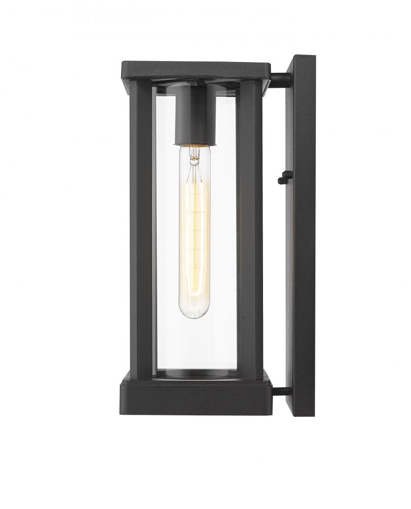 From the Glenwood collection comes this sophisticated and contemporary outdoor wall sconce, which includes a clear glass cylinder globe held by a thin, cage-style aluminum frame. Featuring an elegant, dark black finish that complements your homes already existing facade, this wall sconce lends a striking, handsome element to any outdoor entertainment space. Take several of these sconces and flank a sliding glass door or surround a deck railing for a classy, understated look, while allowing ample lighting for hosting al fresco dinners or late night talks.