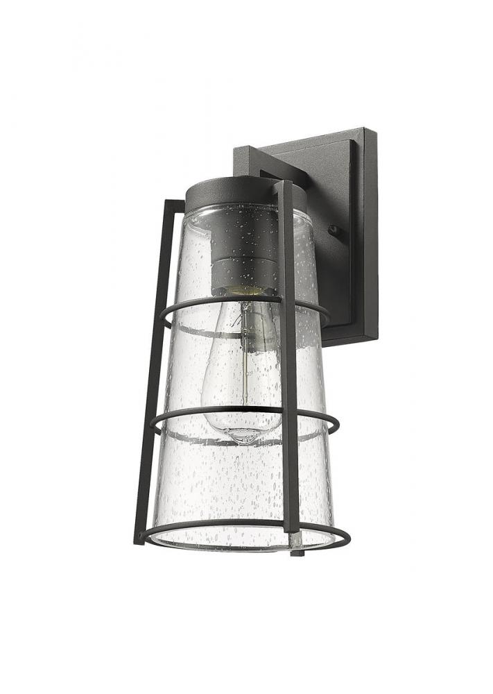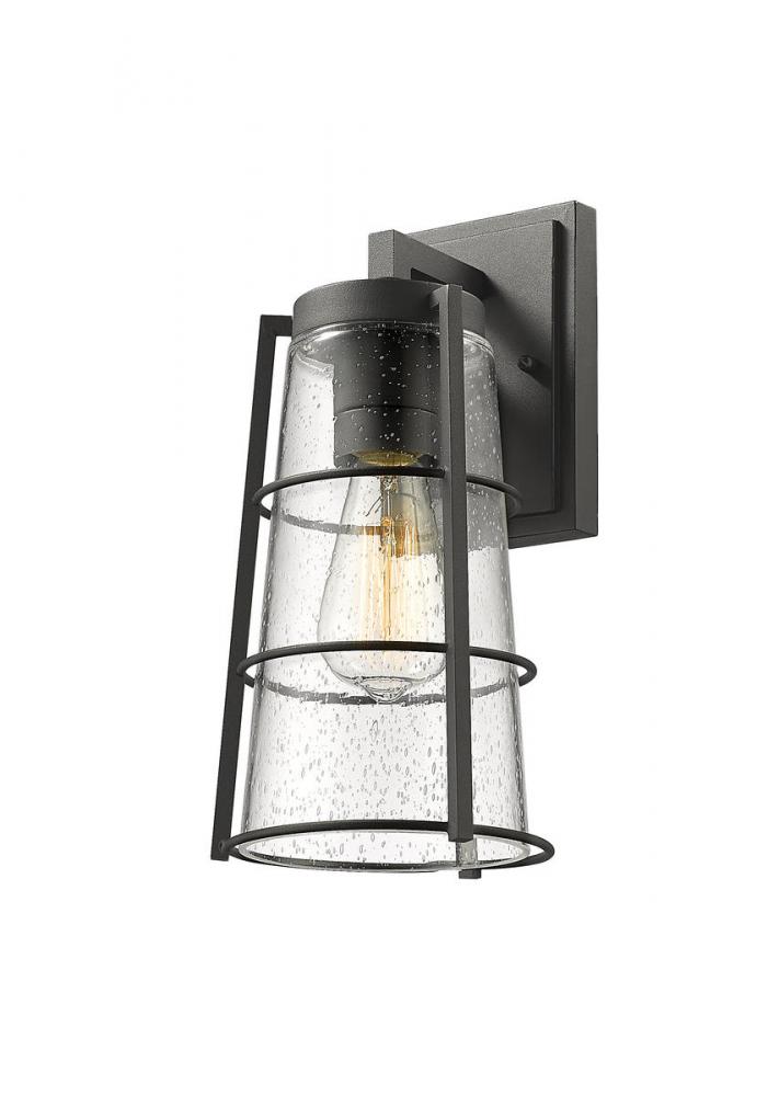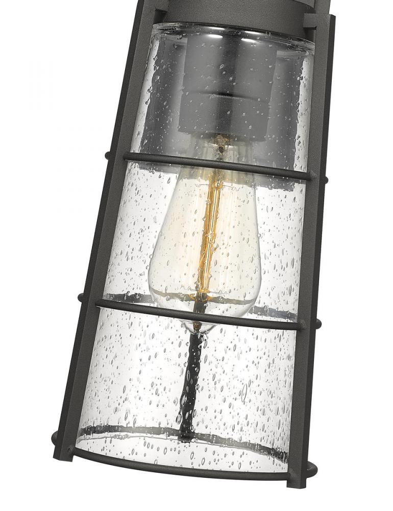 A vintage-inspired attitude delivers charm and style to a modern or transitional structure when this one-light outdoor wall sconce graces a home or business. Sleek clear seedy glass in a conical shade infuses romance to a light housed in a lantern-style hand-worked black aluminum frame. From the Helix collection, this one-light sconce delivers targeted illumination and a sense of sophistication.