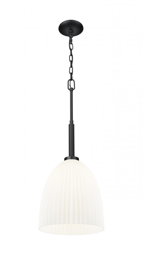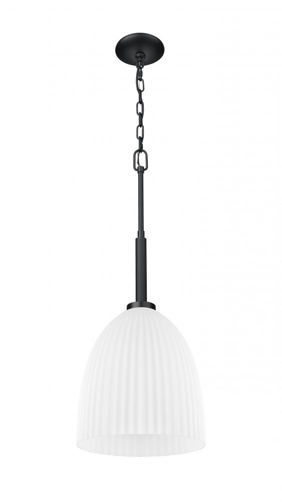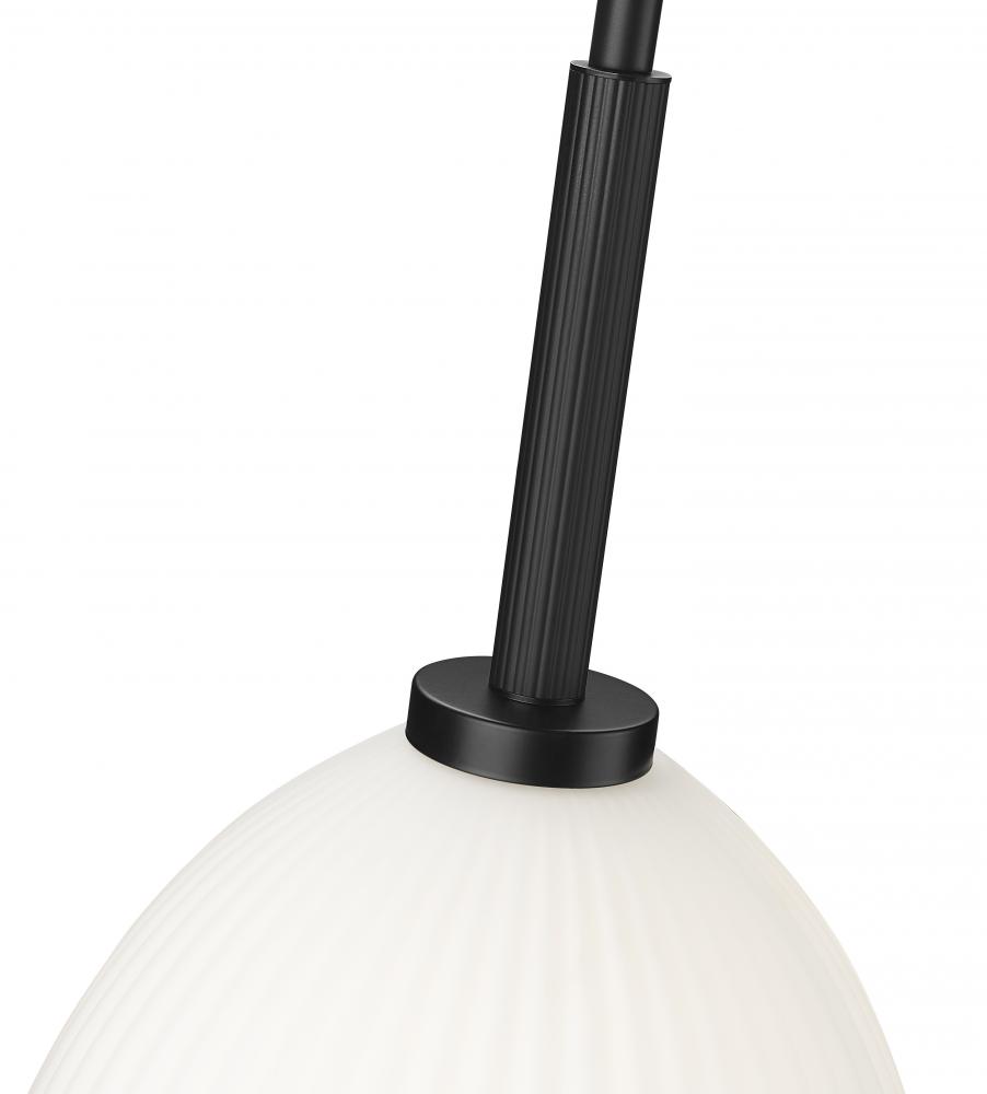 Minimal but impactful, this one-light pendant brings modern edge with its matte black finish and soft matte opal glow. The ribbed glass shade adds quiet texture, making it a standout on its own or grouped in multiples. It?s a small-scale accent that speaks volumes in style.
