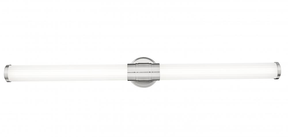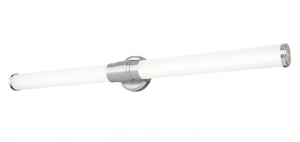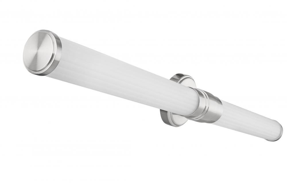 Emphasize modern simplicity and sophistication with this contemporary LED vanity bath light. In a lovely brushed nickel finish, its a generous size perfect for large vanities, offering a linear profile with a pair of ribbed opal glass shades unified with a stepped collar. The integrated LED is dimmable and color selectable, offering energy efficiency and lovely illumination in an eco-friendly home.