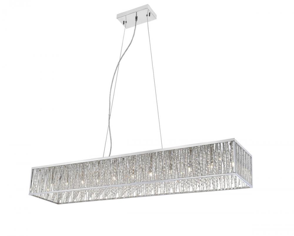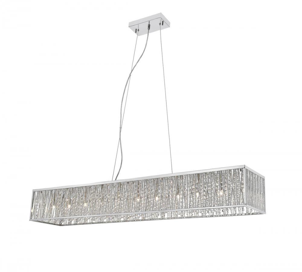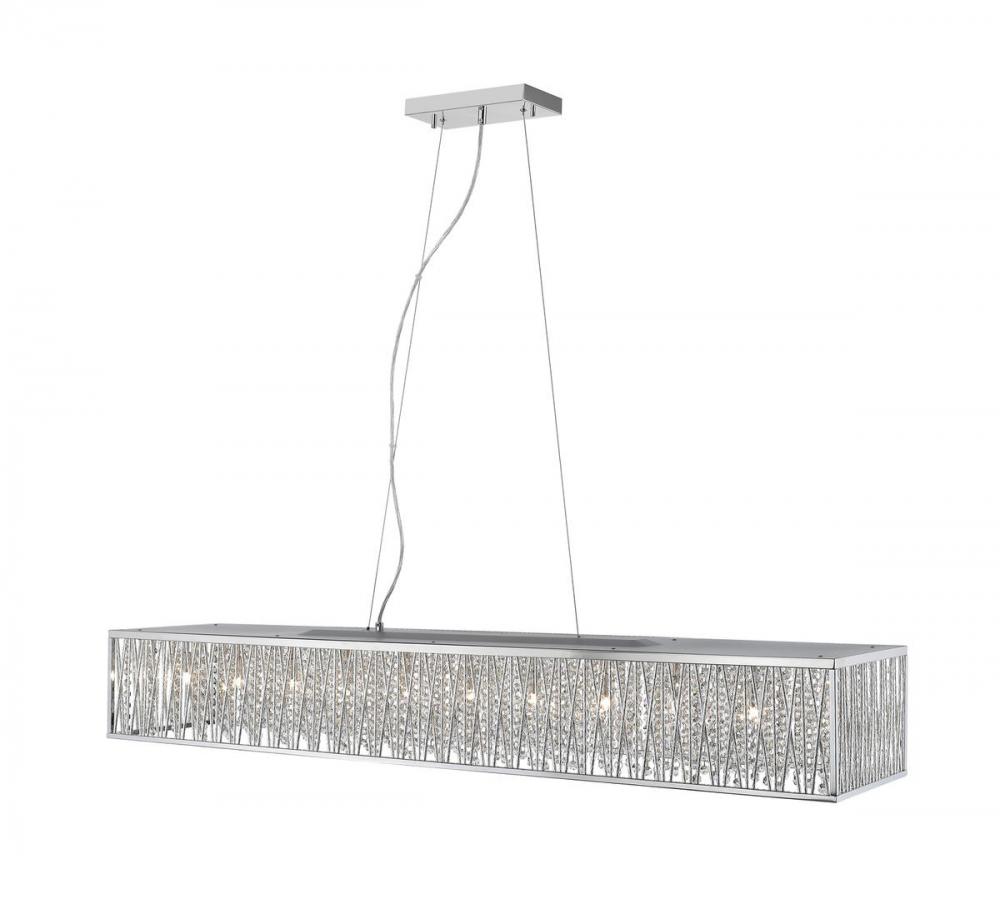 The height of decadence follows this chic, stylish eleven-light island pendant, sending a luxurious ambiance around a kitchen or entertaining space. With a polished chrome finish aluminum frame and polished crystals, it maintains a linear silhouette while indulging in a motif of glam and bling.
