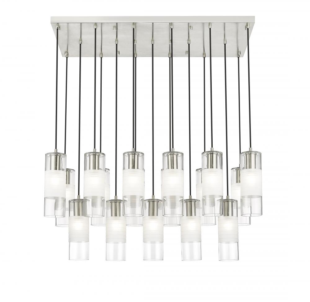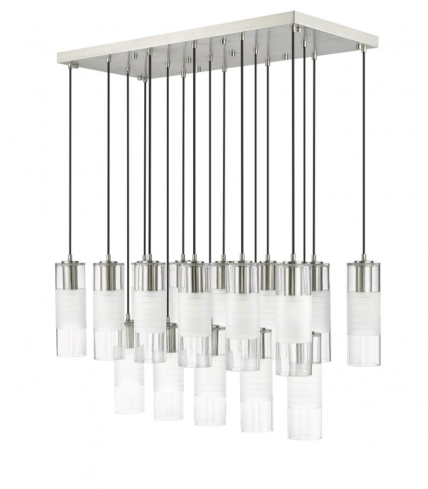 Two tiers create a staggered effect for the individual suspended lights featured in a modern 17-light linear chandelier. From the Alton collection, its deceptive simplicity is enhanced with clear and frosted glass elements and braided clothe cords that effect a fresh, tailored ambiance perfect for sophisticated spaces. Its housings and rectangular canopy receives brushed nickel finish, instilling a sleek, refined sensibility in any space.