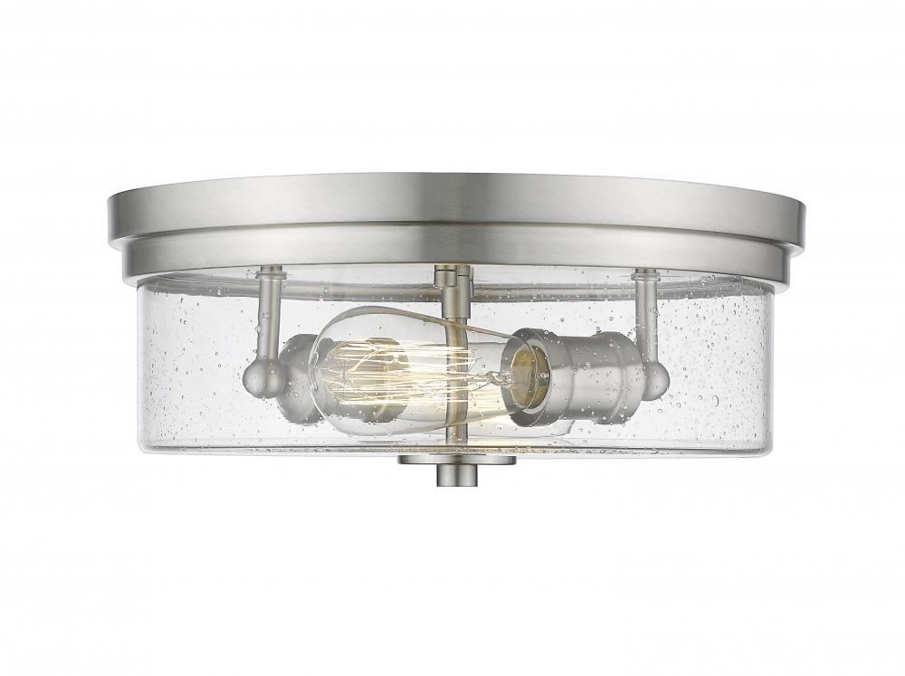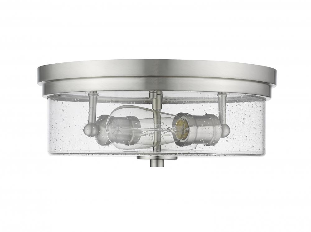 Classic design elements converge to offer a stylish source of illumination for a transitional or contemporary space. Art Deco inspiration forms a gorgeous brushed nickel finish steel base hosting a clear seedy glass shade, creating versatility and elegance in this two-light flush mount ceiling light.