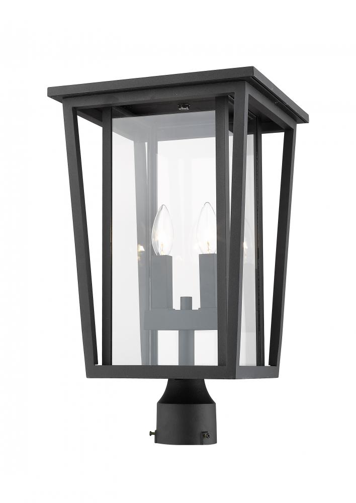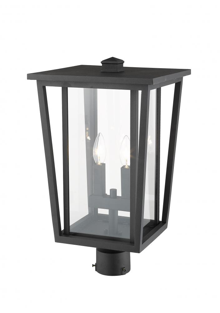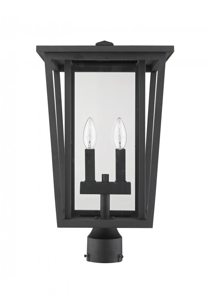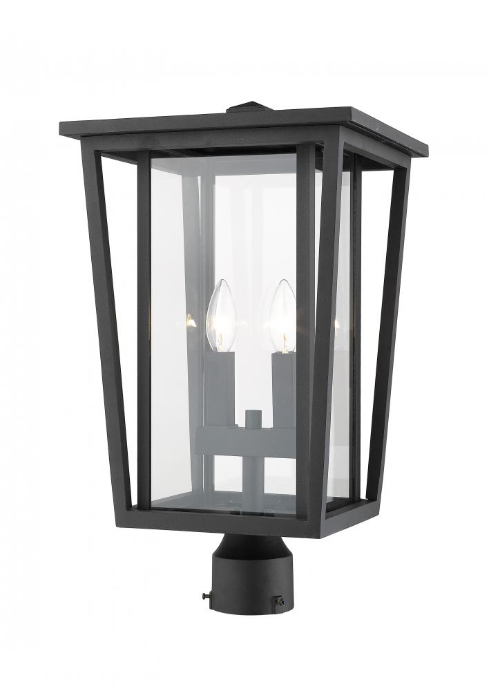 Add a dramatic look to a custom designed exterior space. This outdoor post lantern offers a stylish look with a black finish frame and a pair of charming candelabra base bulbs behind beautiful clear glass.