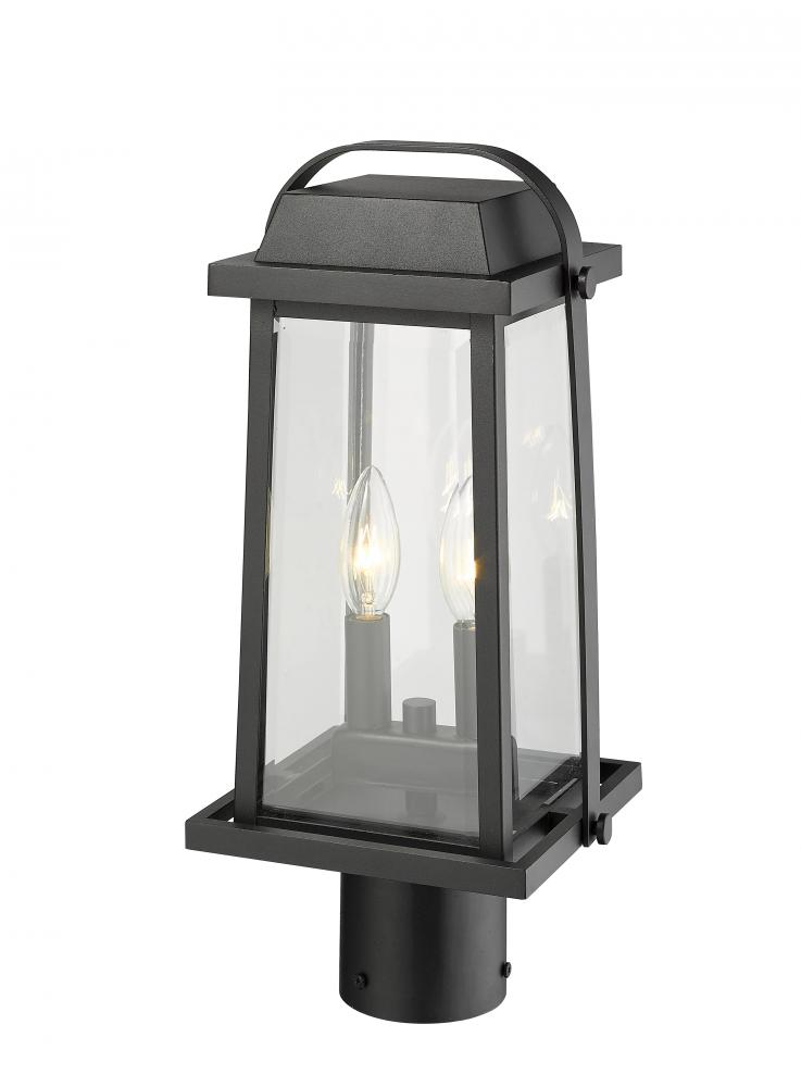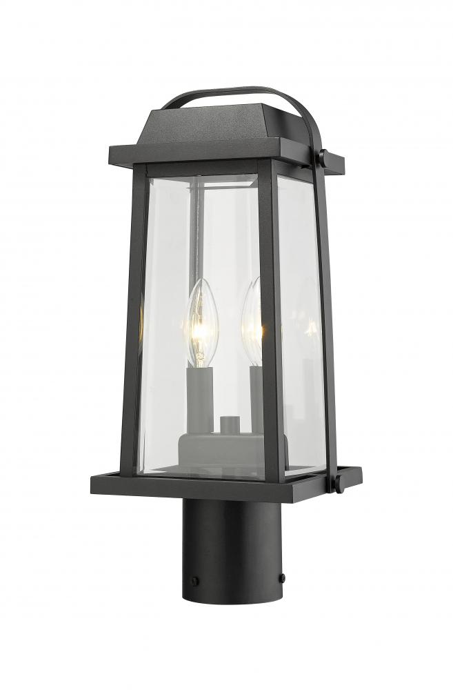 Light a pathway or garden with this charming lantern style outdoor post light. Featuring classic details and a black finish, the light is complete with a two candelabra lights behind clear beveled glass for true, direct illumination.
