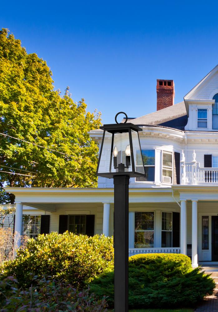 Classic retro style blends village fare with maritime character, adding a sophisticated aesthetic to exterior spaces. From the Broughton collection, this two-light outdoor post-mounted fixture offers construction of sleek black aluminum and clear beveled glass panels on its lantern-style shade. Charming candelabra bulb mounts and a straight framing design seal the deal on a tasteful look.