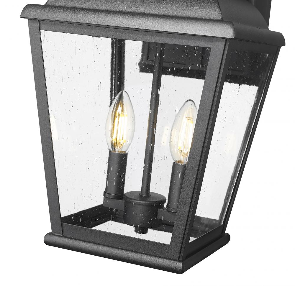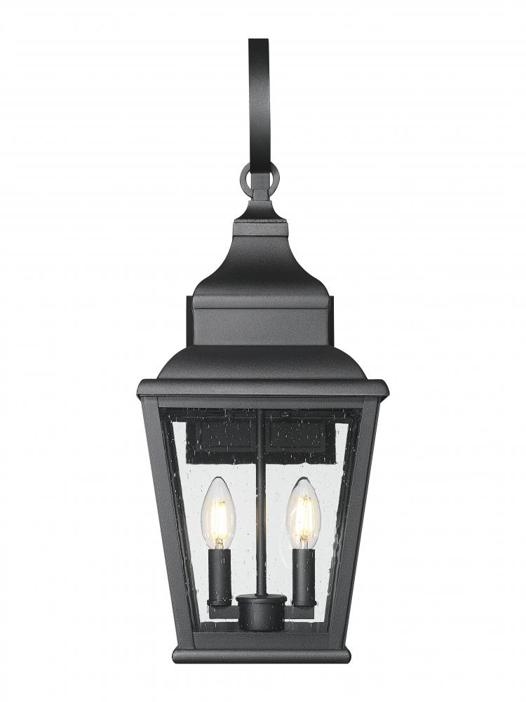 An exterior light with no end of style becomes a must-have fixture as this two-light outdoor wall light checks all the boxes. Porches, decks, and outbuildings welcome this ornate lantern-inspired light made of sand black finish aluminum framing with elaborate accents, and seedy glass panels revealing interior candelabra-style bulb mounts. Adjust lighting levels with convenient, mood-altering dimming features.
