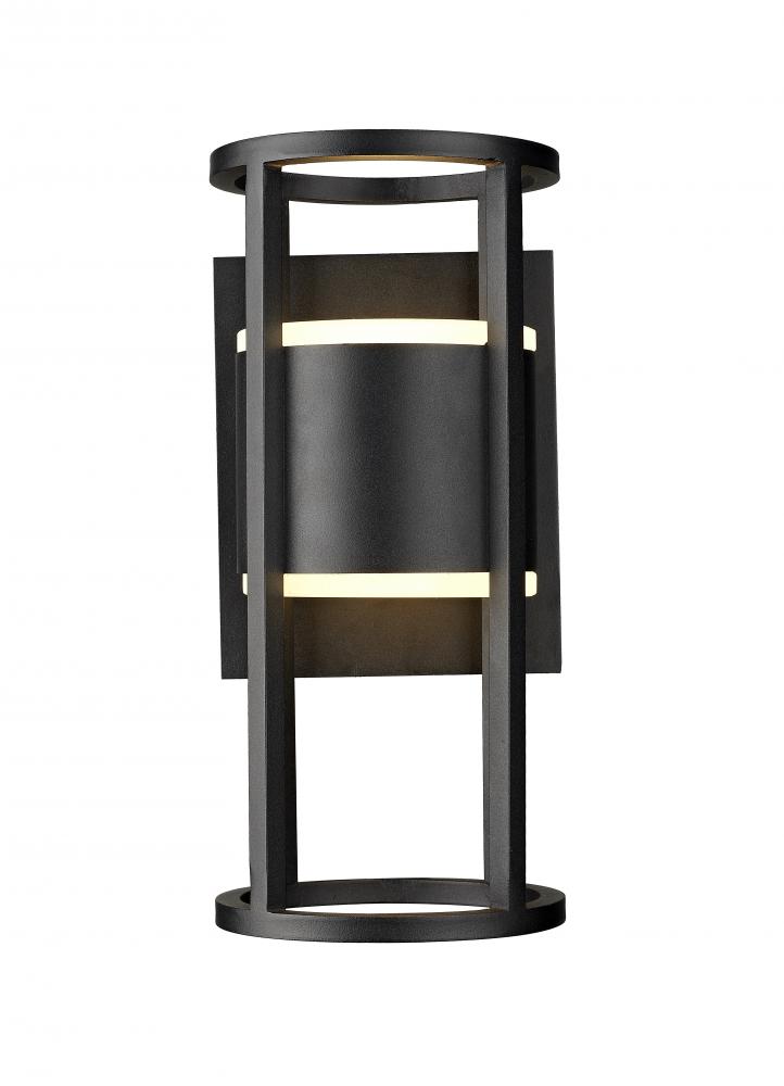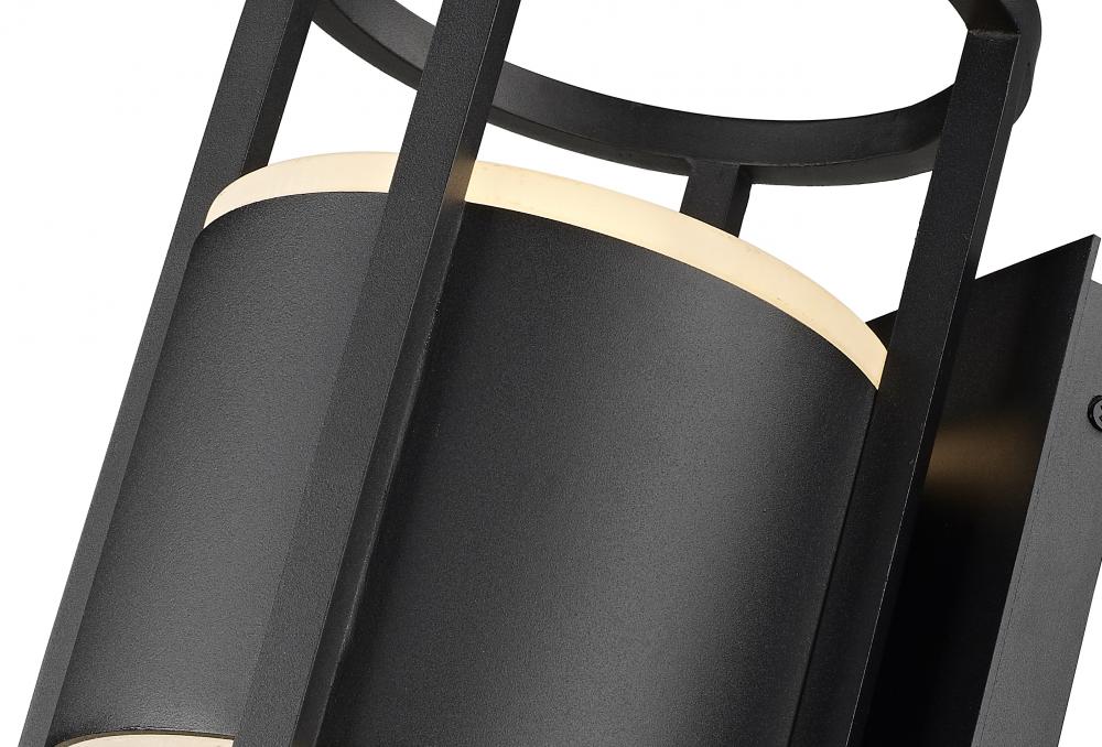 An eye-catching design blueprint brings energy and industrial style to complement a chic exterior space. This two-light outdoor wall sconce from the Luca series offers an openwork cylinder frame and wall plate featuring black aluminum with an etched glass diffuser. LED lighting offers energy efficiency to embellish its value.