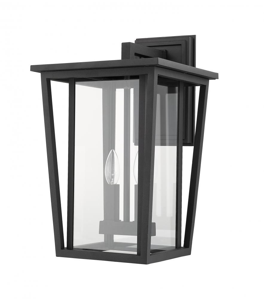 Finish an exterior redesign with an elegant source of lighting. With a geometric profile softened with industrial style, this black finish wall lantern dresses up any space and adds the radiant illumination of two candelabra-base bulb mounts.