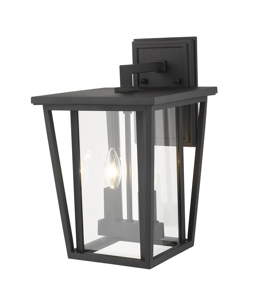 A bold black finish adds definition to the sleek design of this outdoor wall lantern. Ideal for mounting to a structure or deck wall, its clear glass shade nestles a pair of candelabra bulbs and offers a fashionable ambiance.