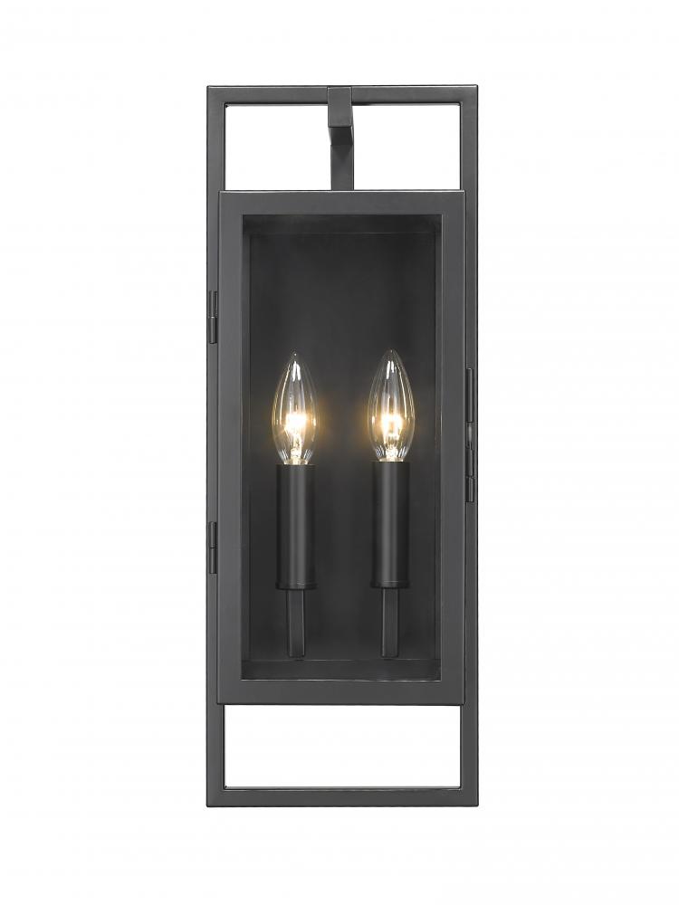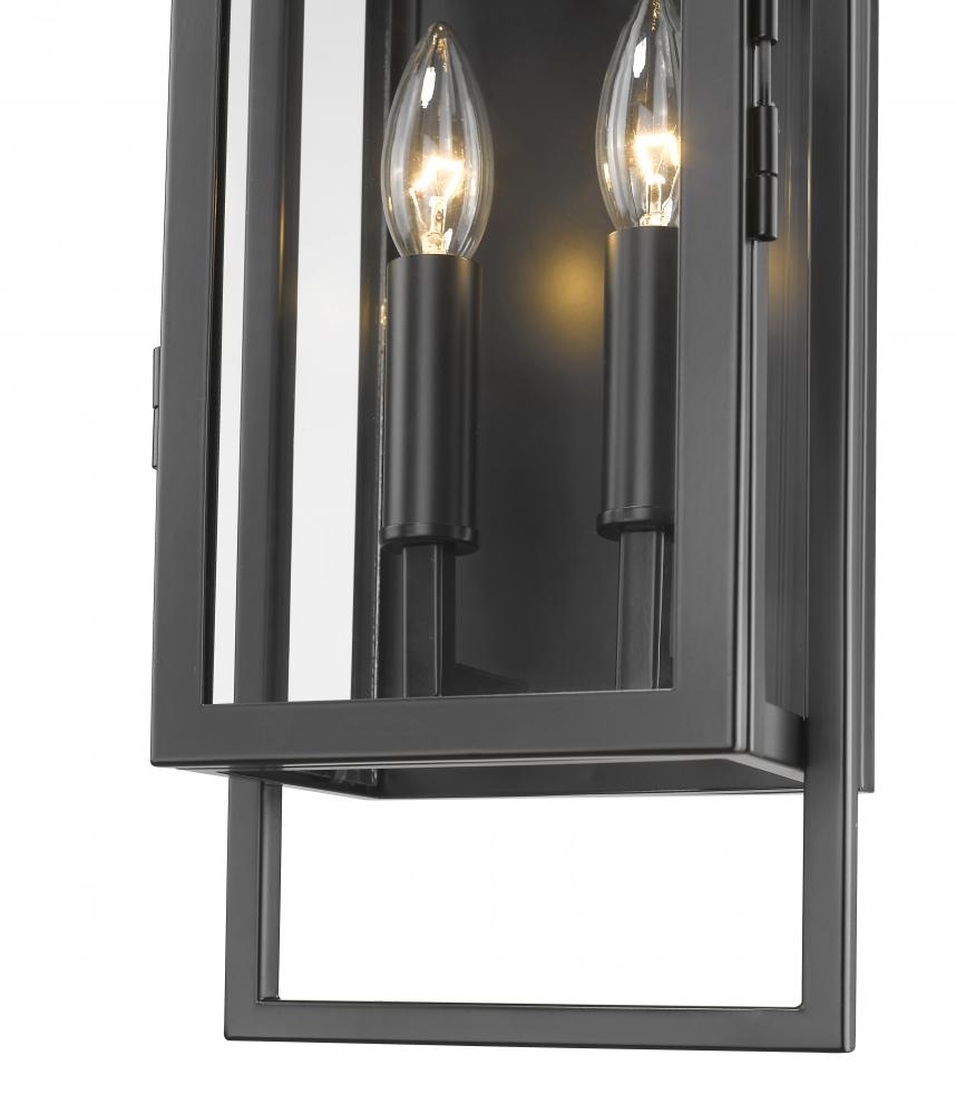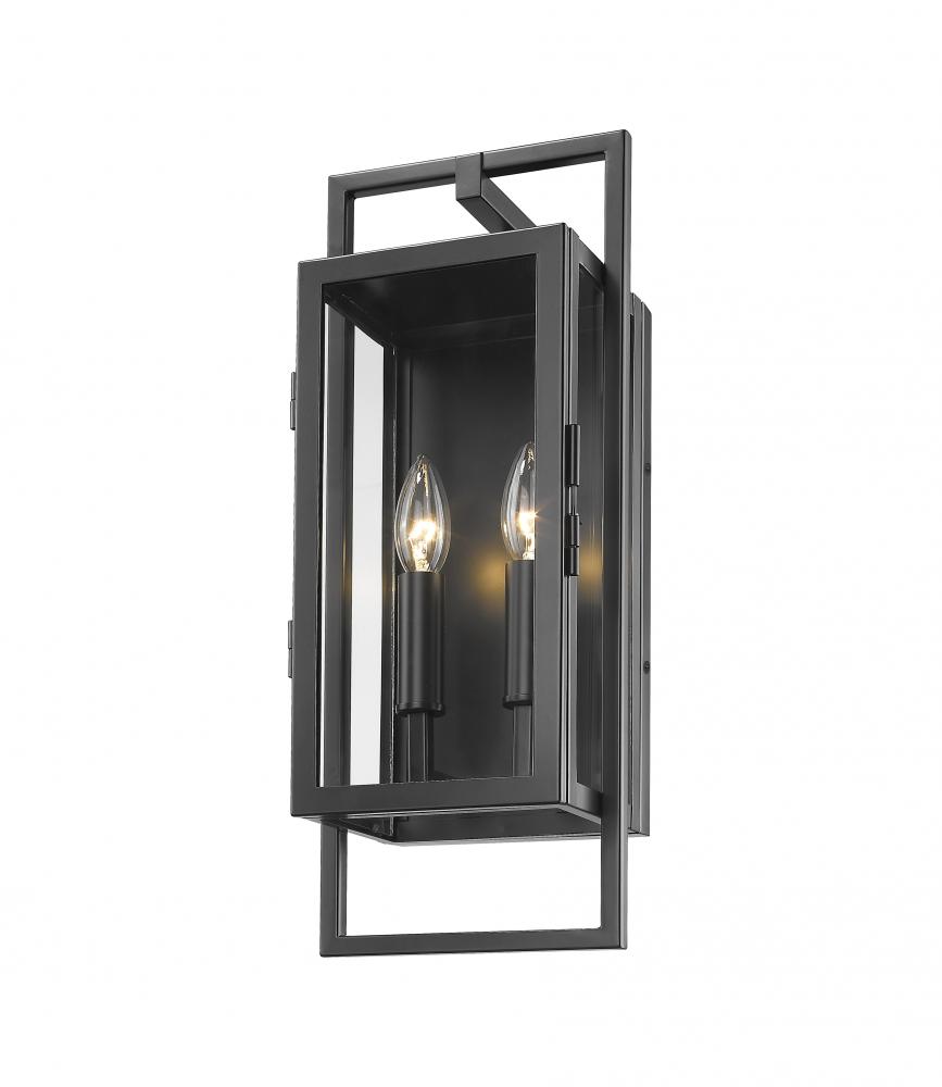 Go with versatility as you add ambient lighting to an exterior space. The Lucian two-light outdoor wall sconce features charming candelabra-style bulbs tucked against a solid back base with an overlaid open frame. Black finish steel and clear glass blend to fashion an irresistible look that heightens the tasteful ambiance of any space.
