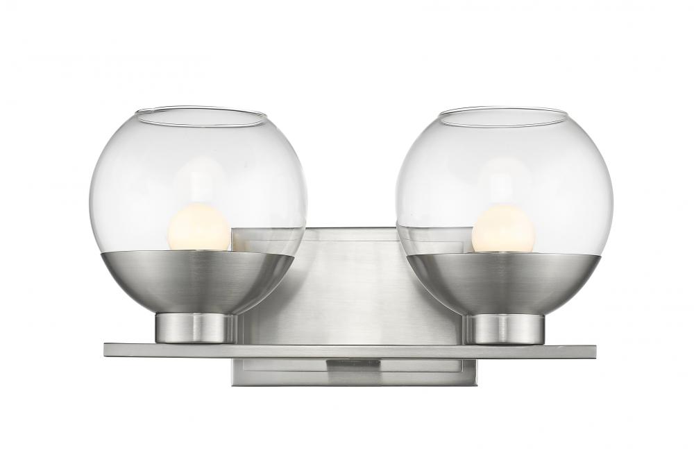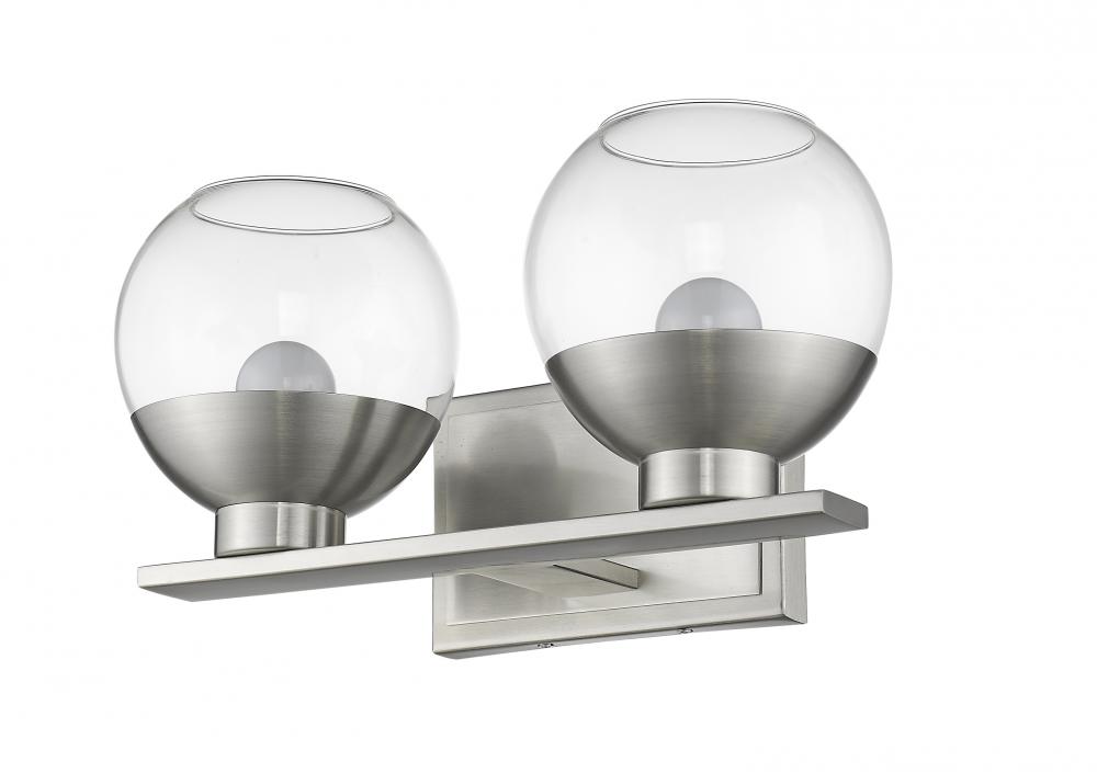 A modern bath space comes to life with the elegance and romance of this two-light vanity. Brushed nickel finish steel blends beautifully with delicate clear glass that forms stylish orb-shaped shades.