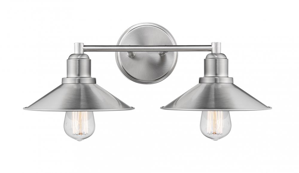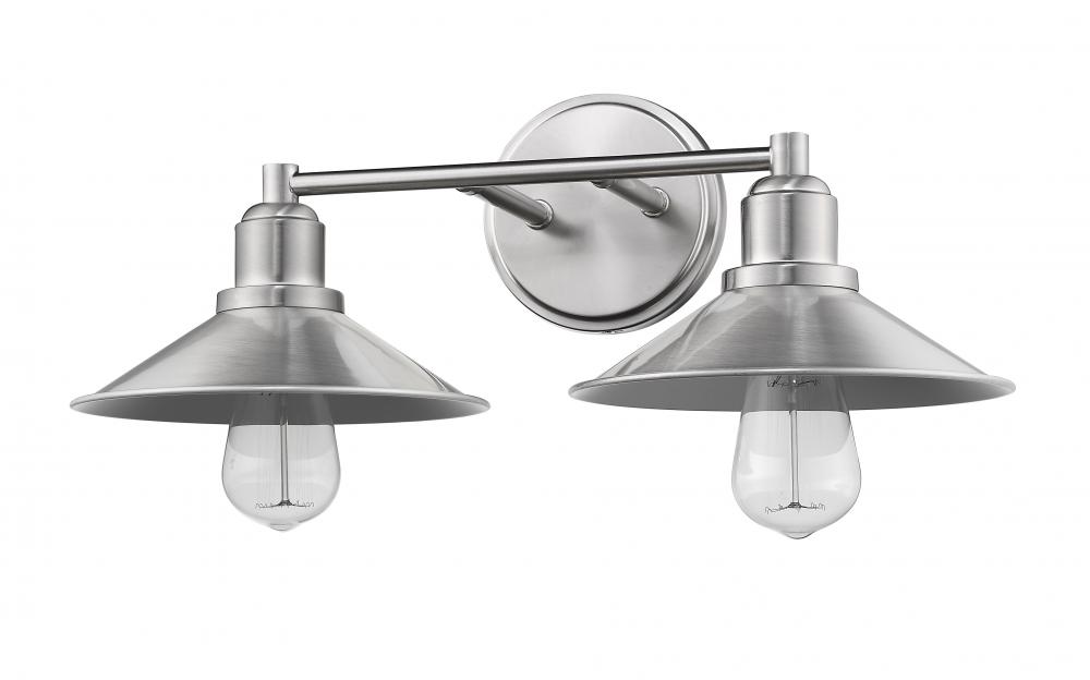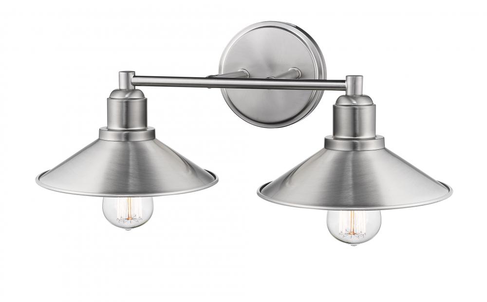 A pair of hood shades creates a stylish balanced look in this two-light vanity fixture. Embellish a bathroom sink space with this elegant element crafted from brushed nickel steel and showcasing charming vintage bulbs.