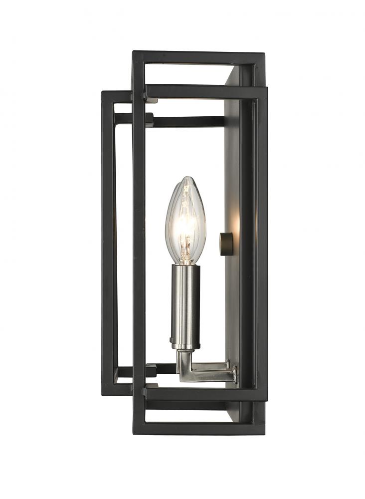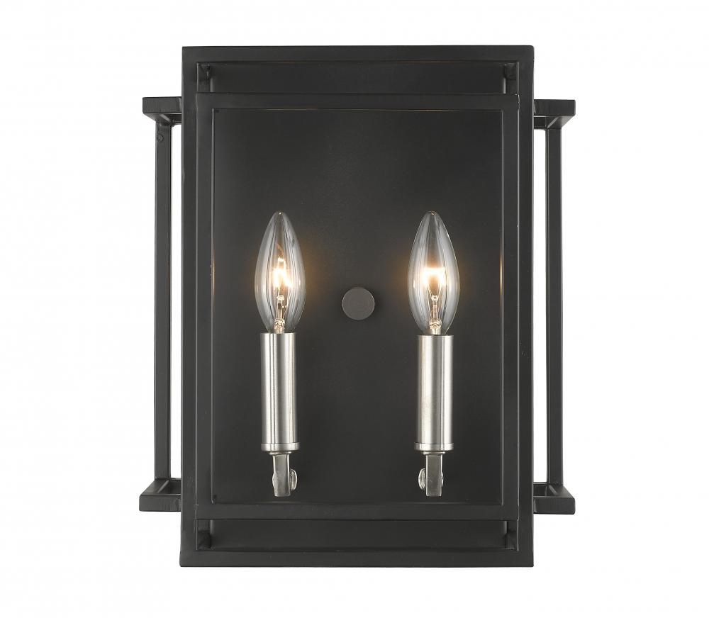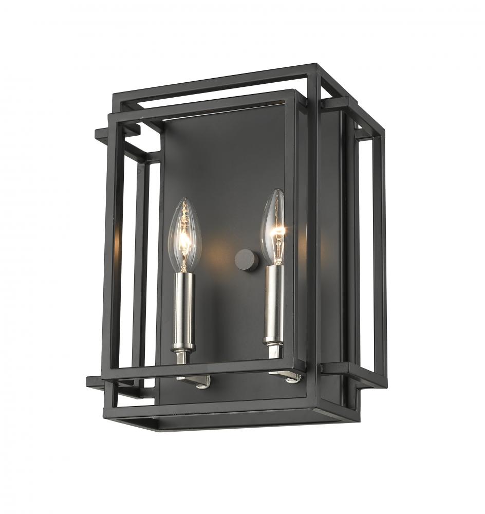 Bold and dramatic, this two-light wall sconce shows off a sleek blend of black and brushed nickel finishes over a boxy steel setting. Enjoy the enchanting addition of candelabra-style bulb bases that cast a delicate and romantic personality and softening effect.