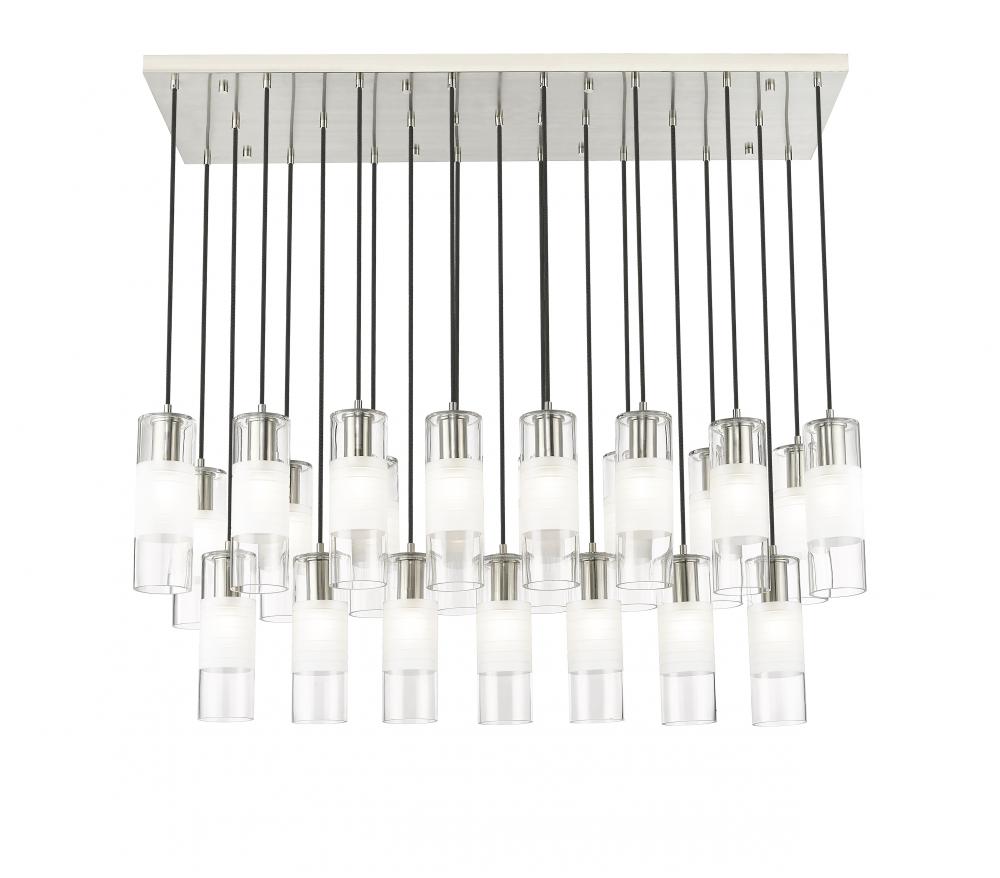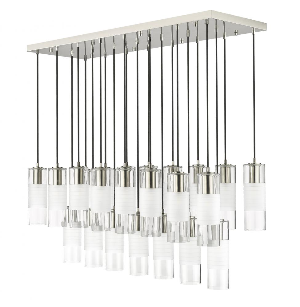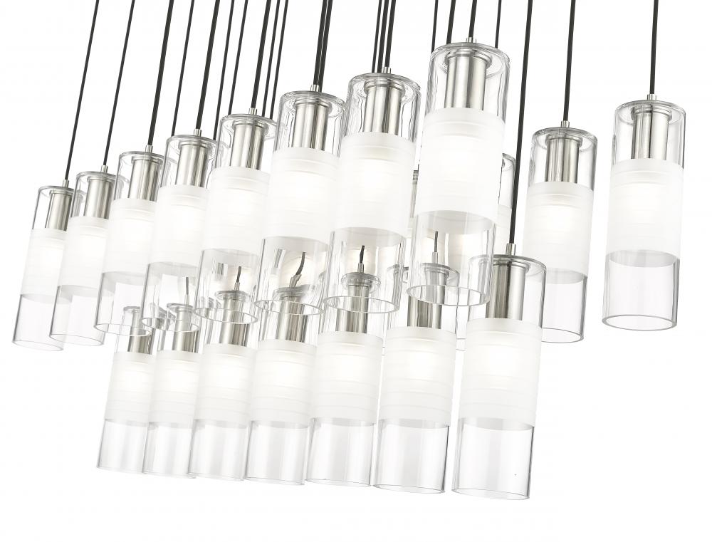 An impressive collection of 23 lights ensures grand scale for a modern linear chandelier from the Alton collection. Brushed nickel finish housings host clear and frosted glass, creating soft, inviting illumination and a sense of substance. Black braided cloth cord covers add a tailored touch, suspending lights in three rows and two tiers to deliver bold, sculptural style over an island, foyer, or dining table.
