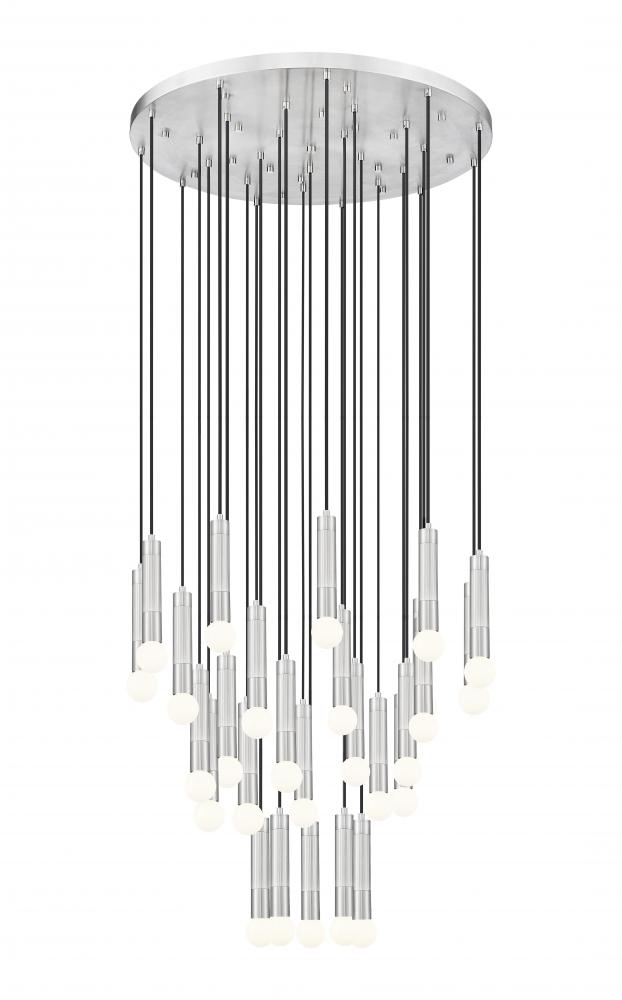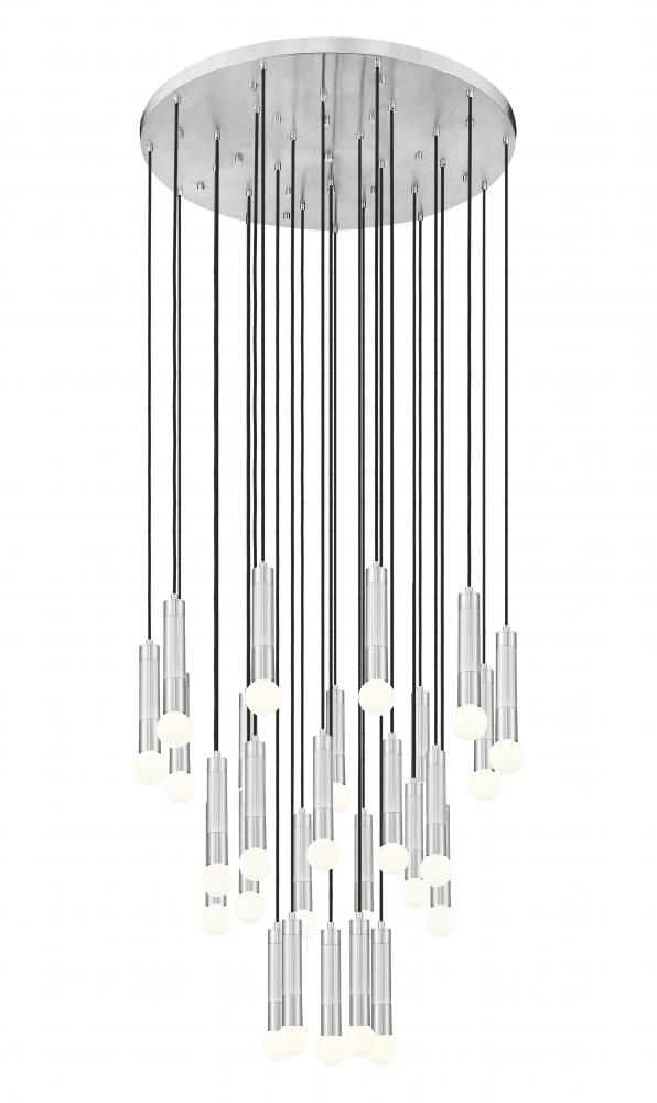 Capture the magic of modern simplicity with a striking 27-light round chandelier. Its a gorgeous display of elongated tubes and a brushed nickel finish, offering gleaming elegance over your living or dining room setting. Braided cord ensures an upgraded effect, delivering on a designer aesthetics in a refined home or commercial space.