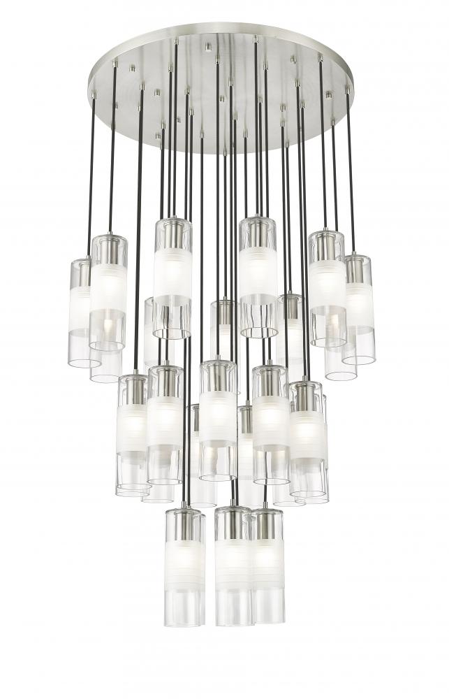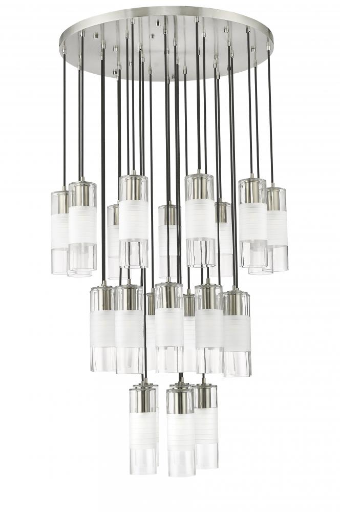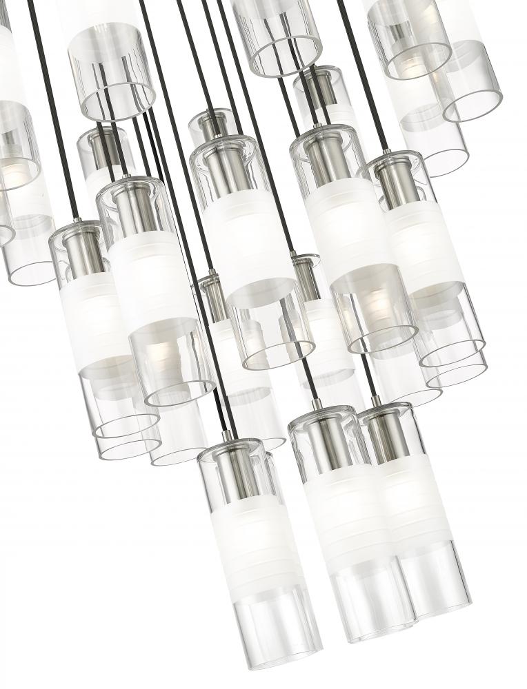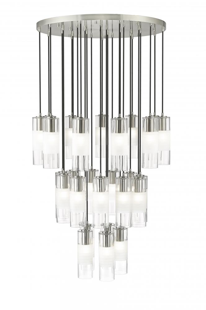 A trio of round tiers create a waterfall effect for 27 suspended lights that make up the Alton modern chandelier. Stunning over a staircase of grand dining table, it sparkles with clear and frosted glass elements and robust housings in a rich brushed nickel finish that gleams in the light.