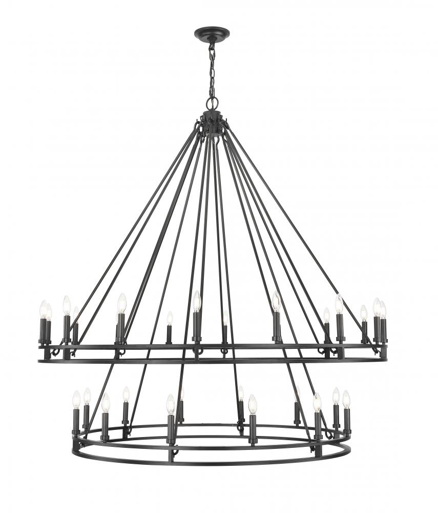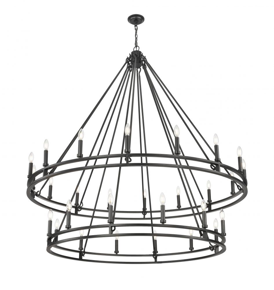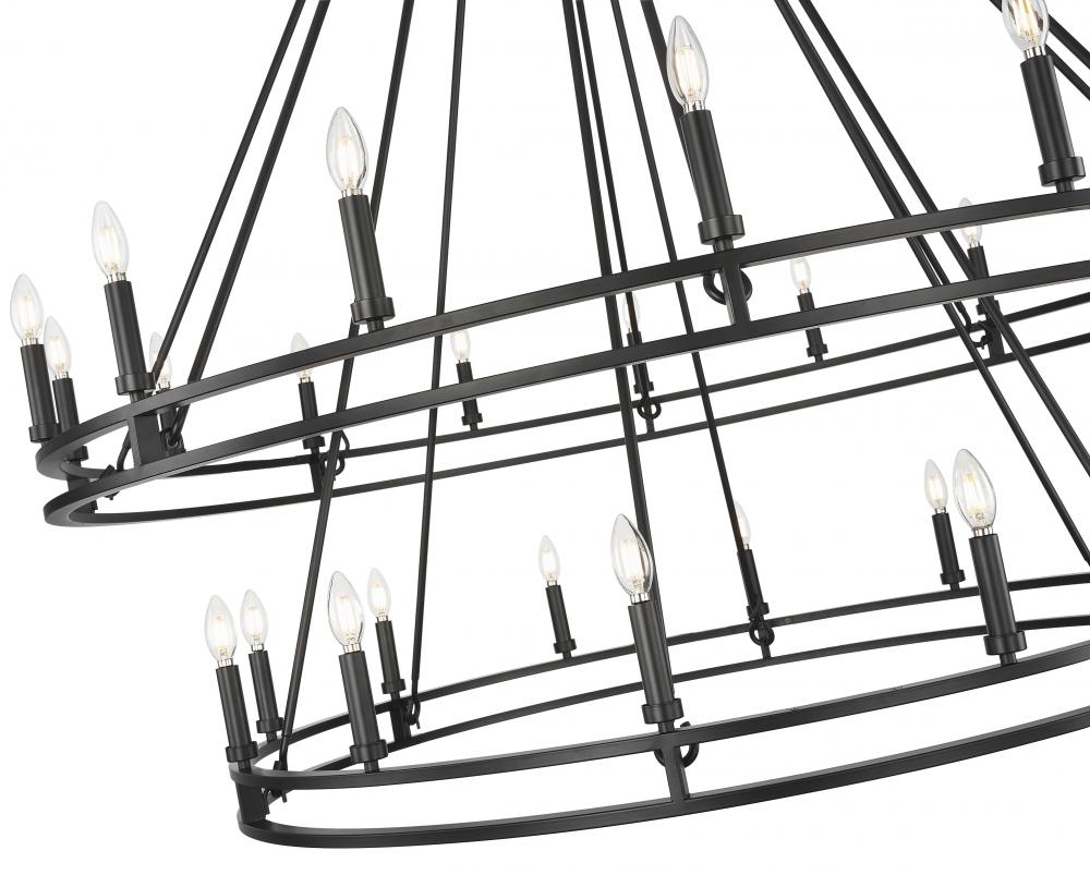 Go bold and eye-catching with this modern 28-light chandelier with a two-tiered silhouette. The inverted dimensions of the fixture, with a larger ring above a smaller ring, creates a dynamic look, perfect for high ceilings or over a grand staircase. Matte black is a perfect complement to the clean simplicity of the chandelier, while candelabra lights offer a touch of delicacy.
