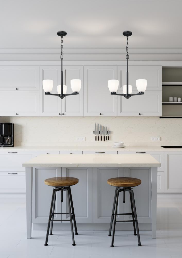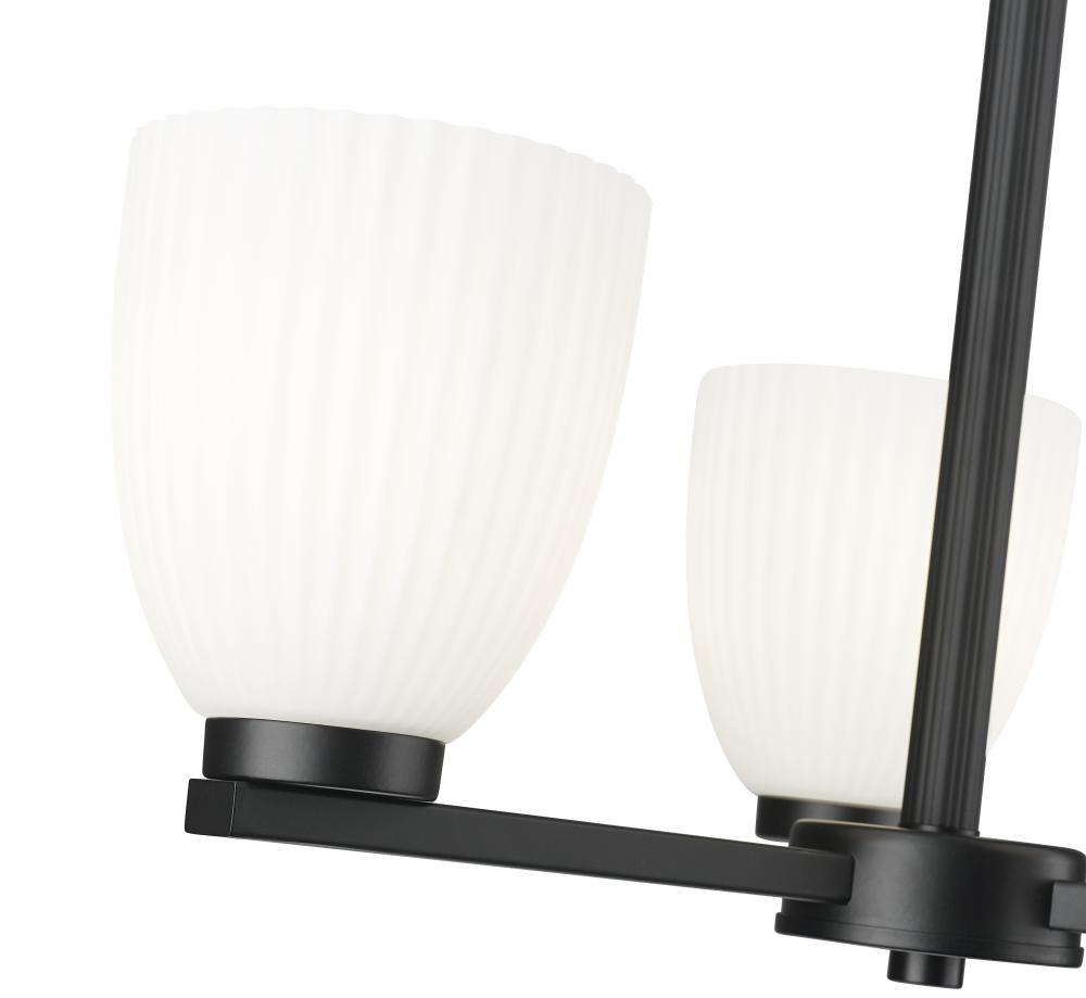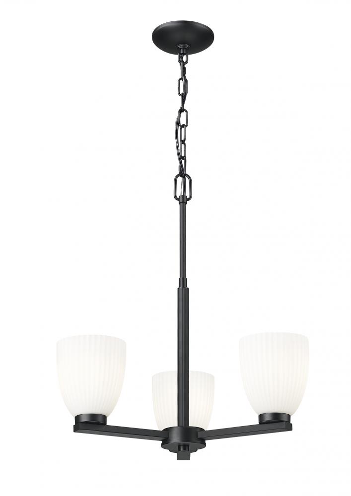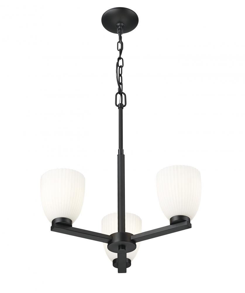 Framed in a matte black finish and glowing with matte opal glass, this three-light chandelier brings sculptural presence to any space. Ribbed opal shades diffuse the light with quiet elegance, creating a soft and balanced ambiance. It?s a refined focal point that anchors the room with effortless style.