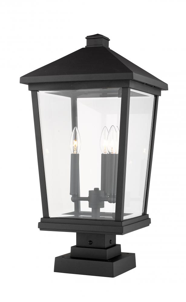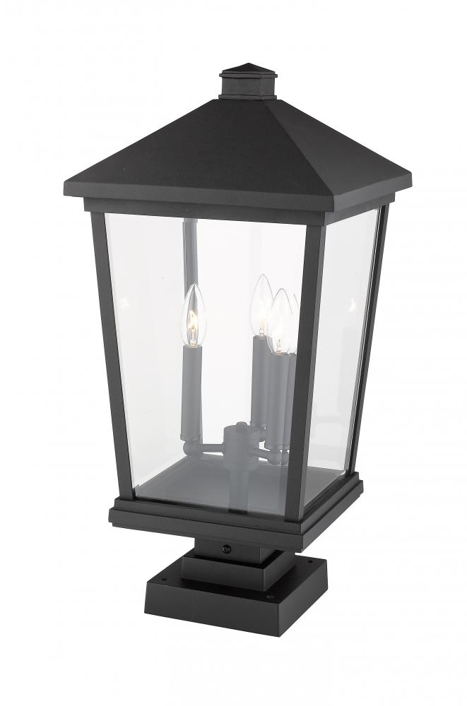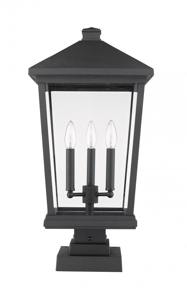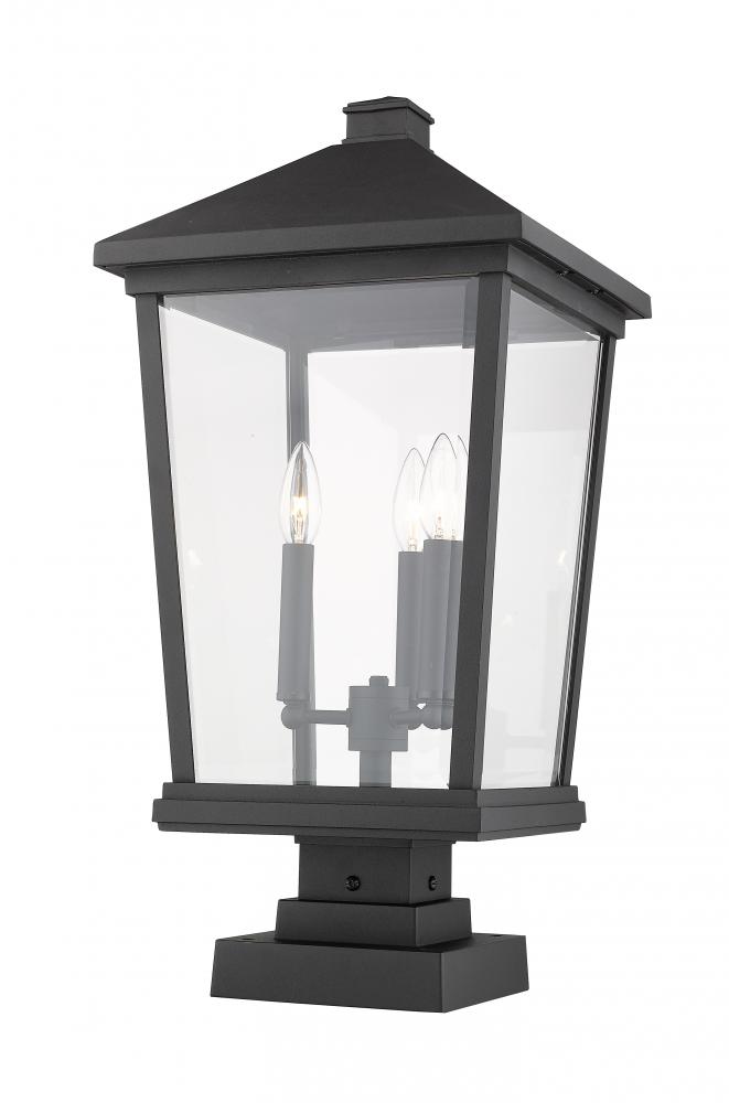 Light up a custom garden or walkway with the stylish look of this three-light outdoor post light. A bold black finish frame hosts three candelabra bulb mounts that deliver a charming village feel.