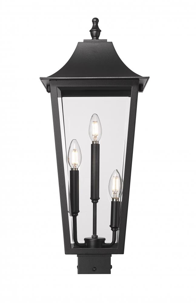 Instill a fresh, welcoming sensibility with the timeless details of a traditional three-light outdoor post mount fixture and its elongated silhouette. Three candelabra lights are tucked within, while clear beveled glass panels create a sense of depth and dimension for its elongated silhouette. Coastal black finish lends durability over a stainless steel frame, perfect for patios, decks, and walkways.