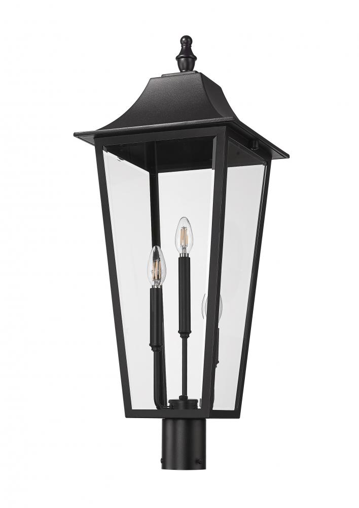 A gracefully sloped top and tapering glass panes create a refined silhouette for this traditional three-light outdoor post mount lantern. Its classic elegance is highlighted with a stainless steel frame and durable Coastal black finish. Clear beveled glass delivers excellent illumination, perfect for a front porch or backyard deck.